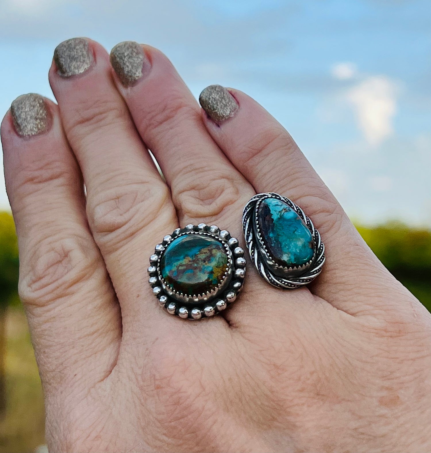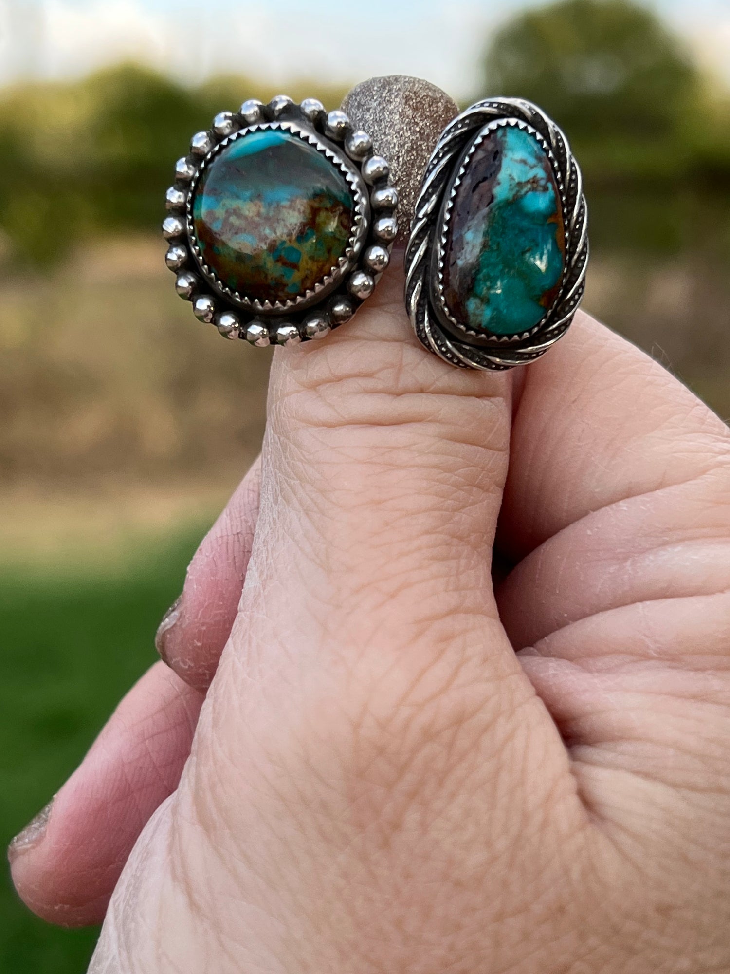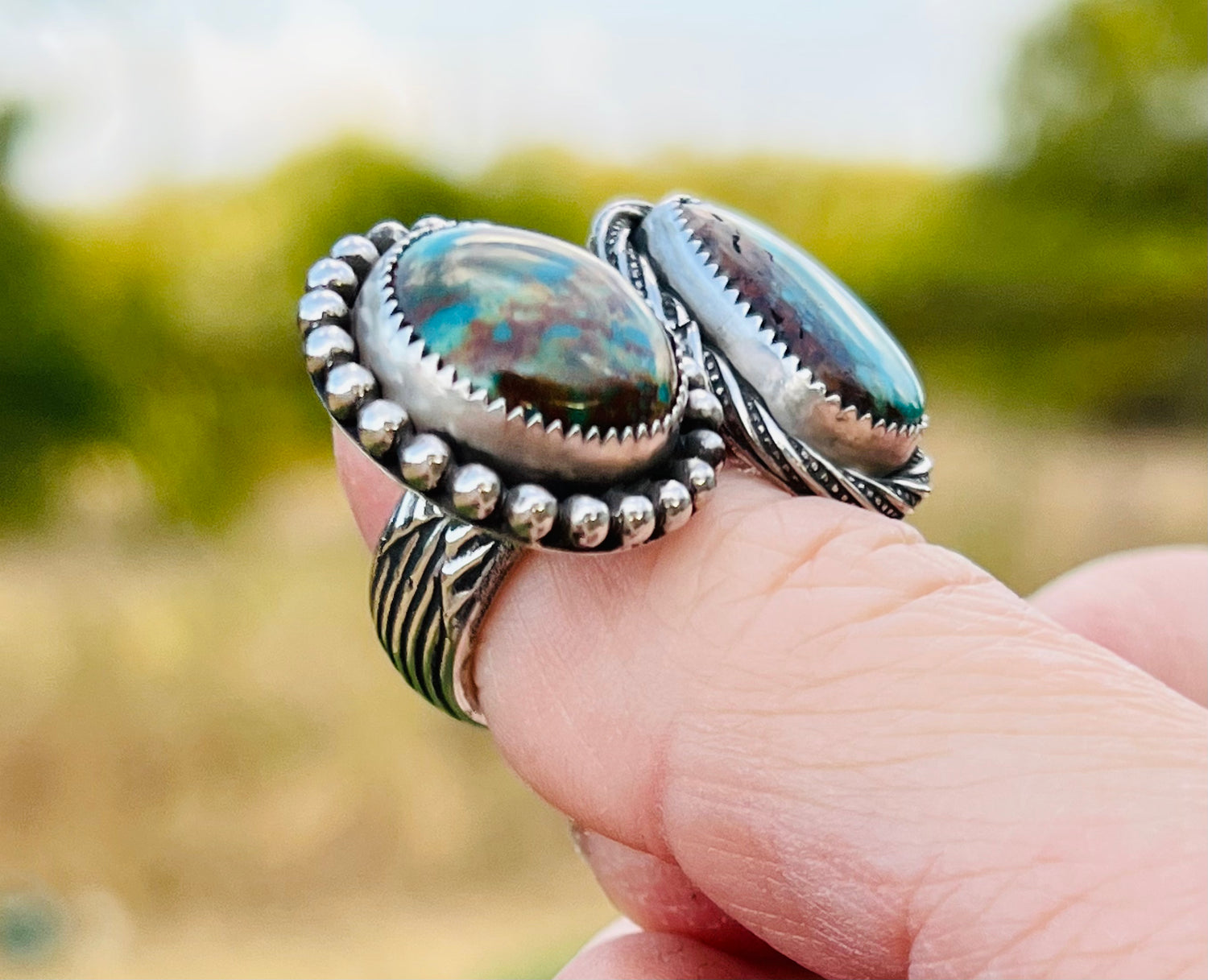 It features 2 gorgeous stones: with one beautifully designed ring shank! These Turquoise Mountain stones stand out above the rest & have such beautiful, rich hues of blues, greens & browns. This ring is a size 7 1/4 & is not very adjustable due to the heavy, solid band. It’s comfortable to wear & is a show stopper!