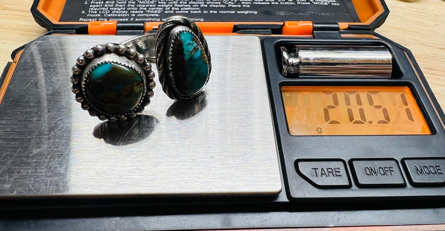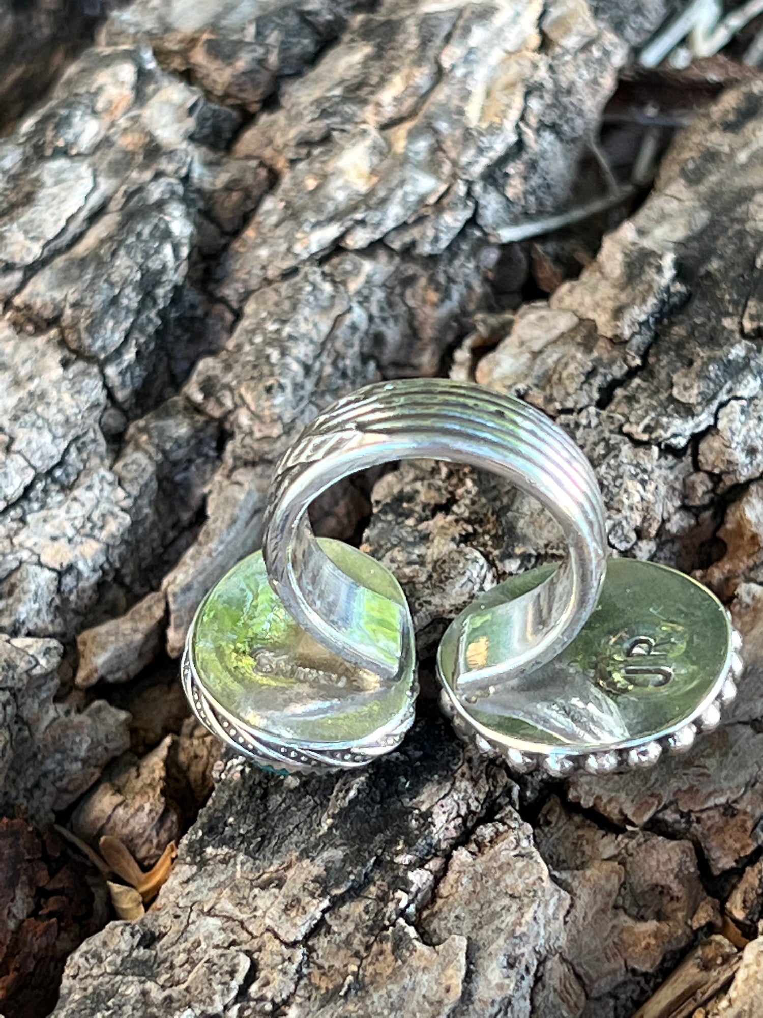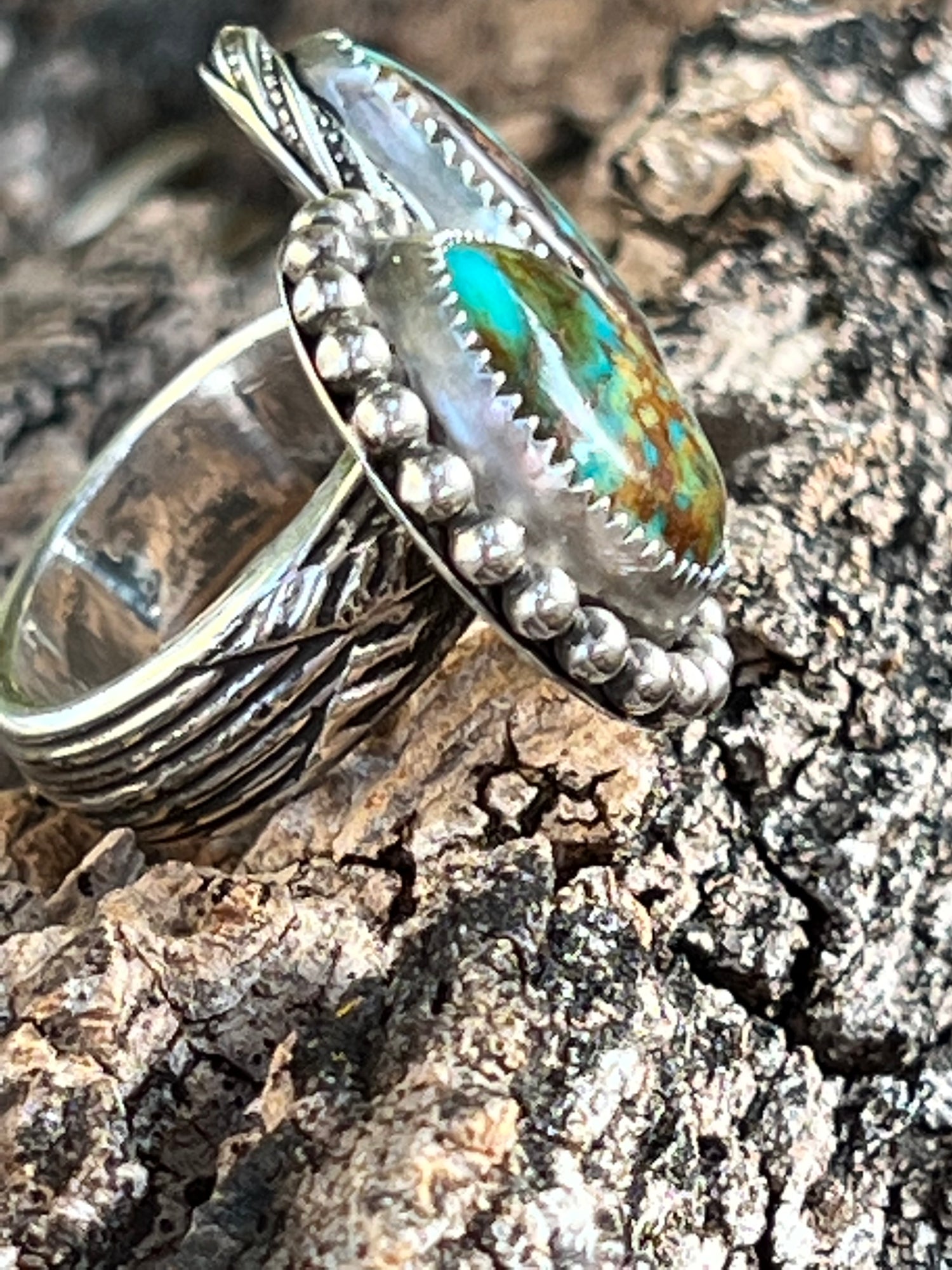 It features 2 gorgeous stones: with one beautifully designed ring shank! These Turquoise Mountain stones stand out above the rest & have such beautiful, rich hues of blues, greens & browns. This ring is a size 7 1/4 & is not very adjustable due to the heavy, solid band. It’s comfortable to wear & is a show stopper!