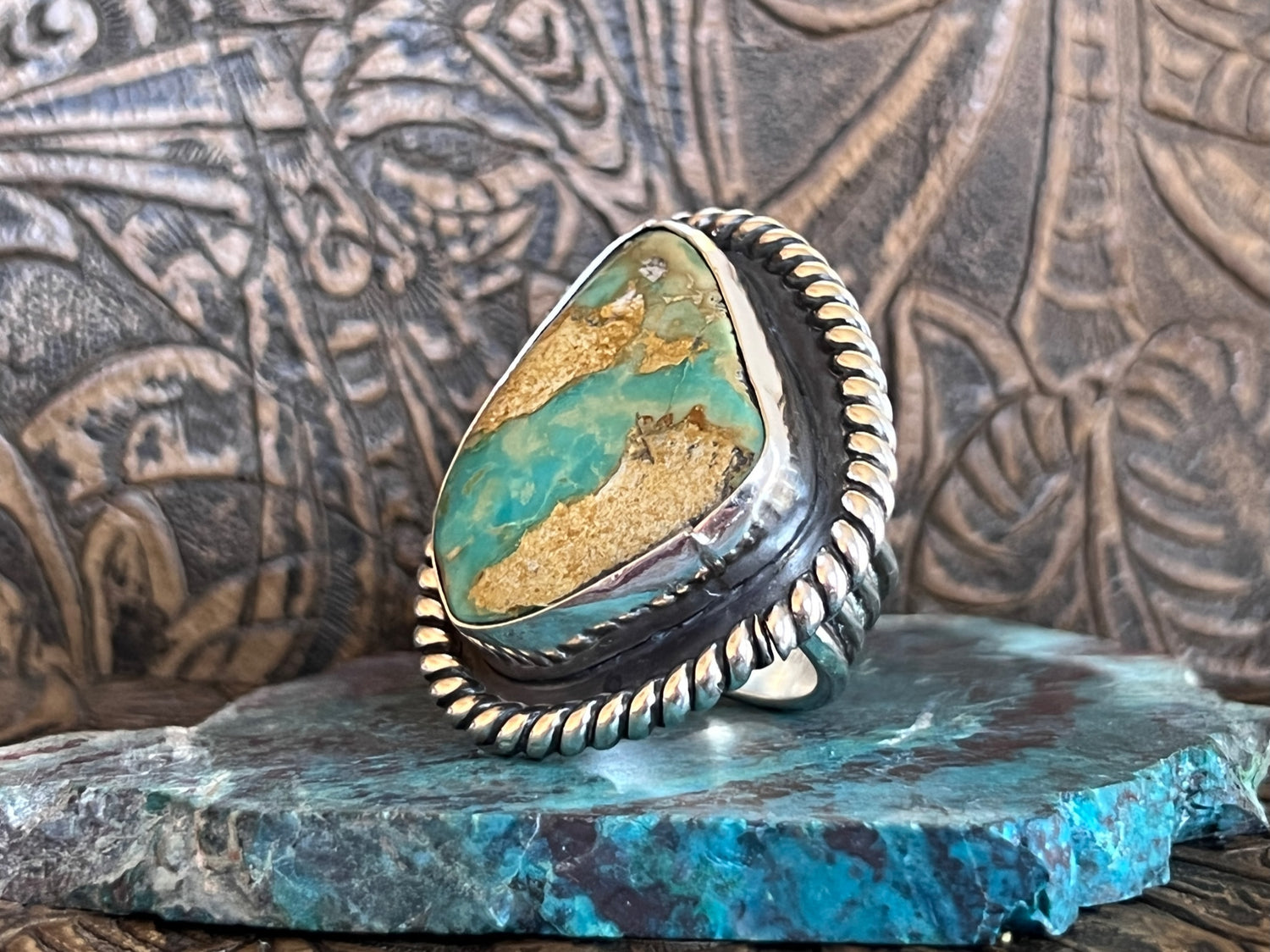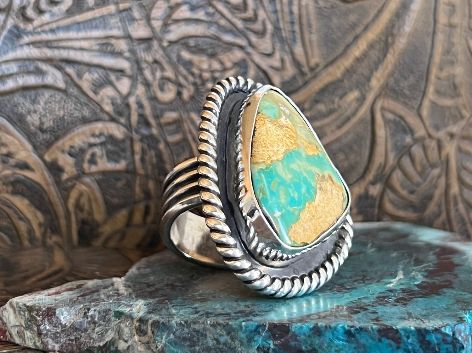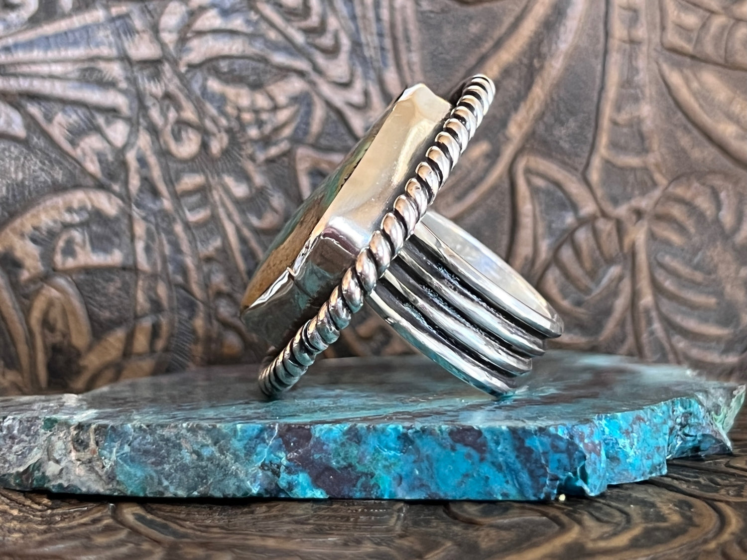 Freeform Turquoise shapes are our favorite here at Fresh Fire Trading! This ring features an AMAZING stone with beautiful color & matrix. It is accentuated by the dark oxidation surrounding it & the very heavy gauge twisted rope around it! The 4 row band with oxidation pairs perfectly with the style of this ring & you are sure to love it.