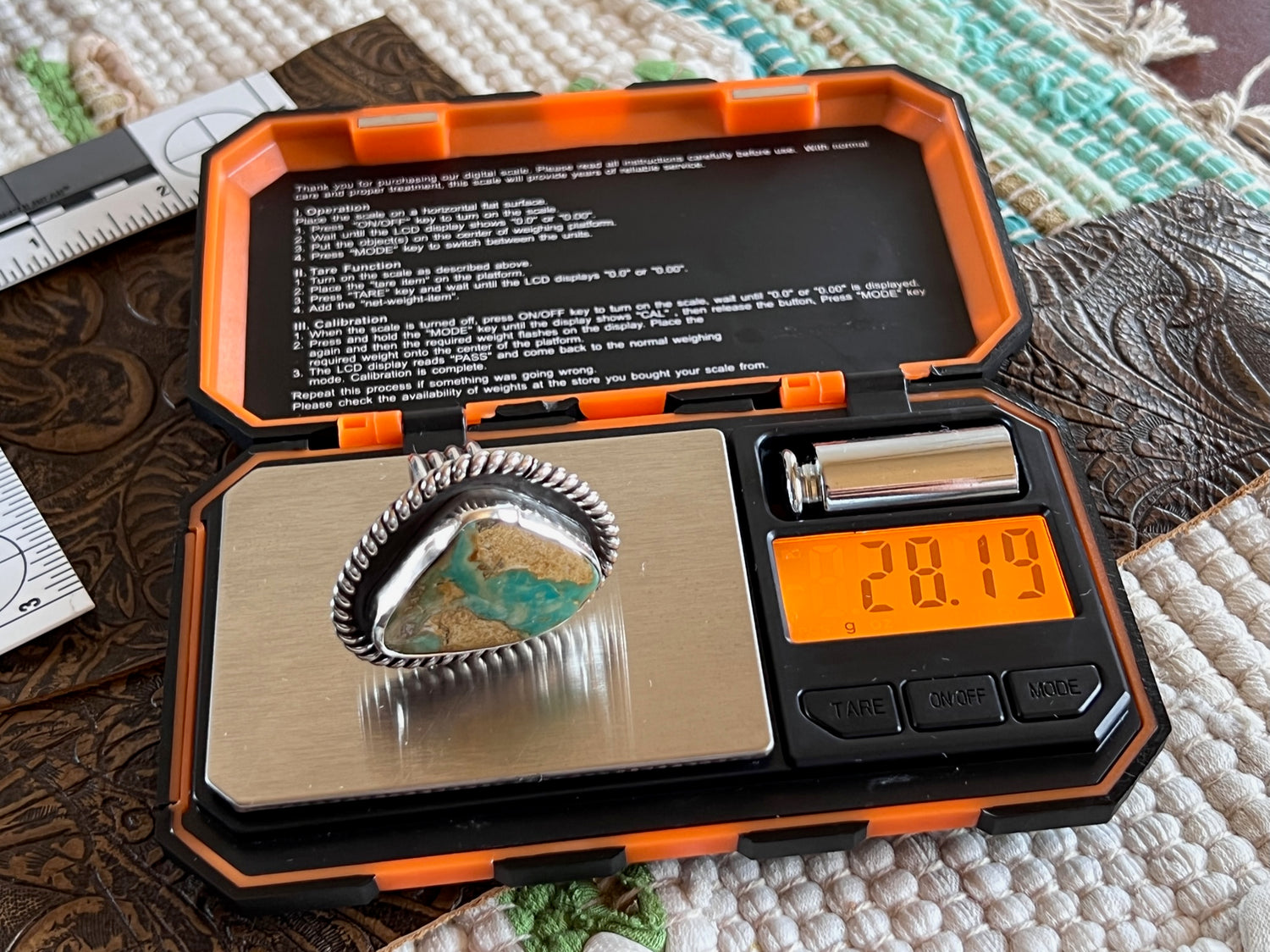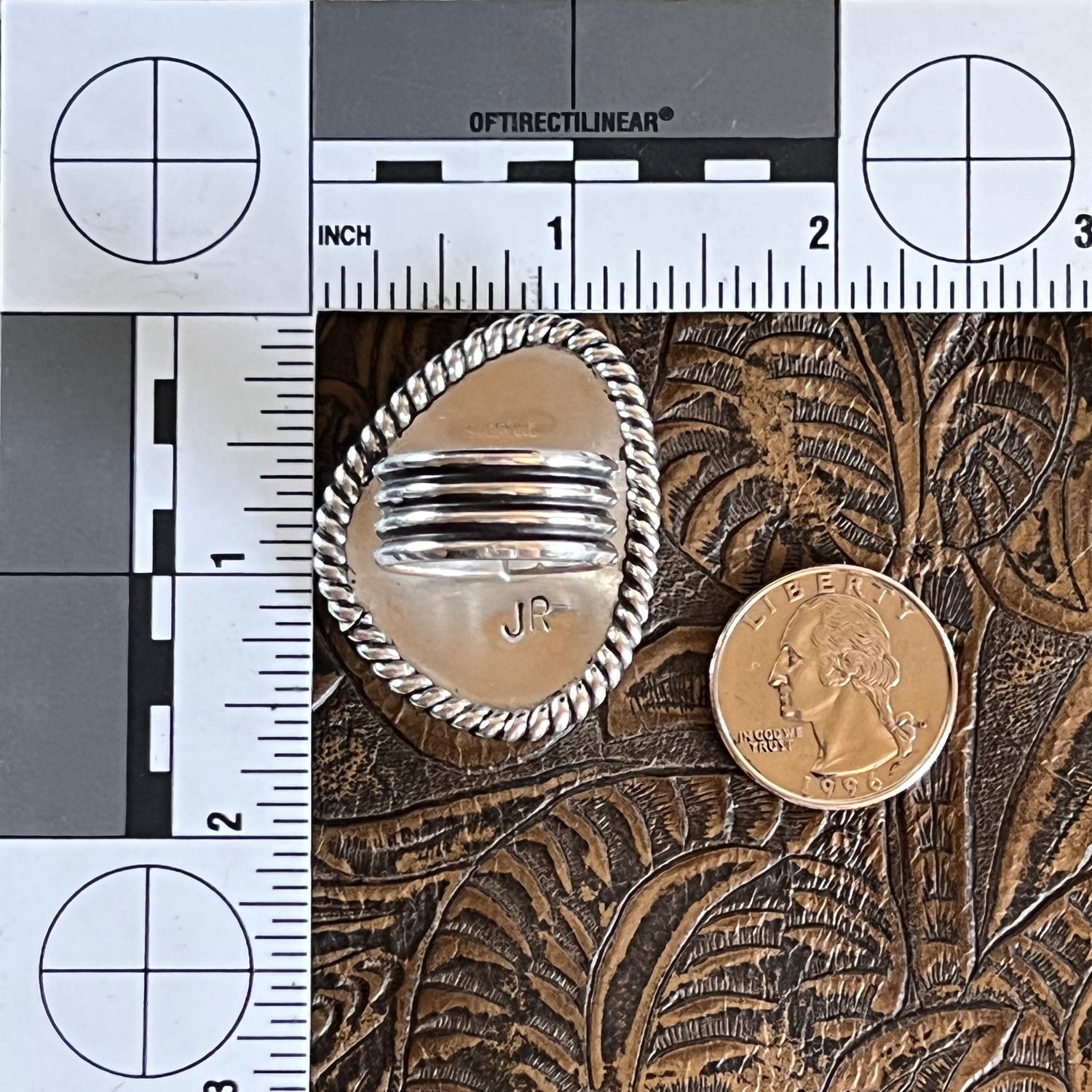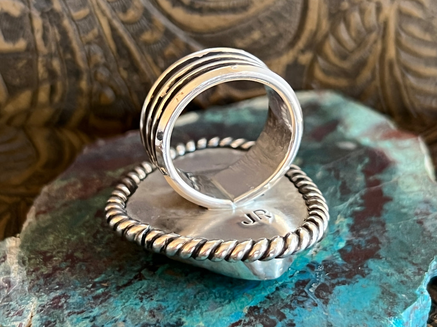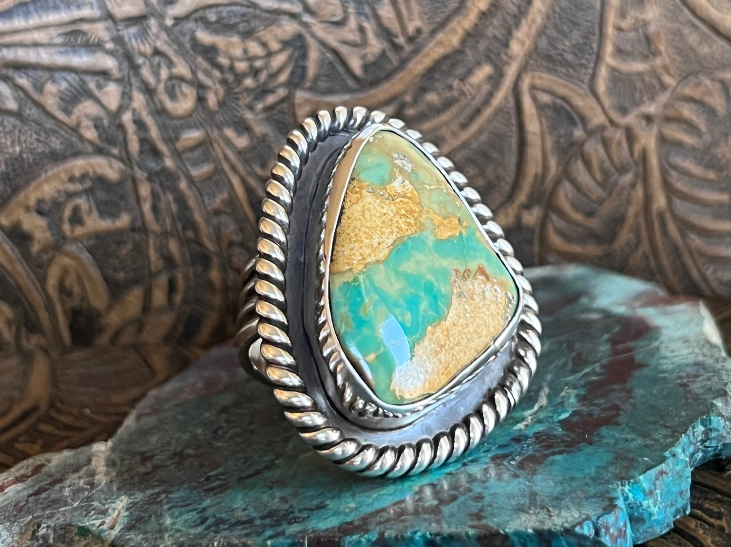 Freeform Turquoise shapes are our favorite here at Fresh Fire Trading! This ring features an AMAZING stone with beautiful color & matrix. It is accentuated by the dark oxidation surrounding it & the very heavy gauge twisted rope around it! The 4 row band with oxidation pairs perfectly with the style of this ring & you are sure to love it.