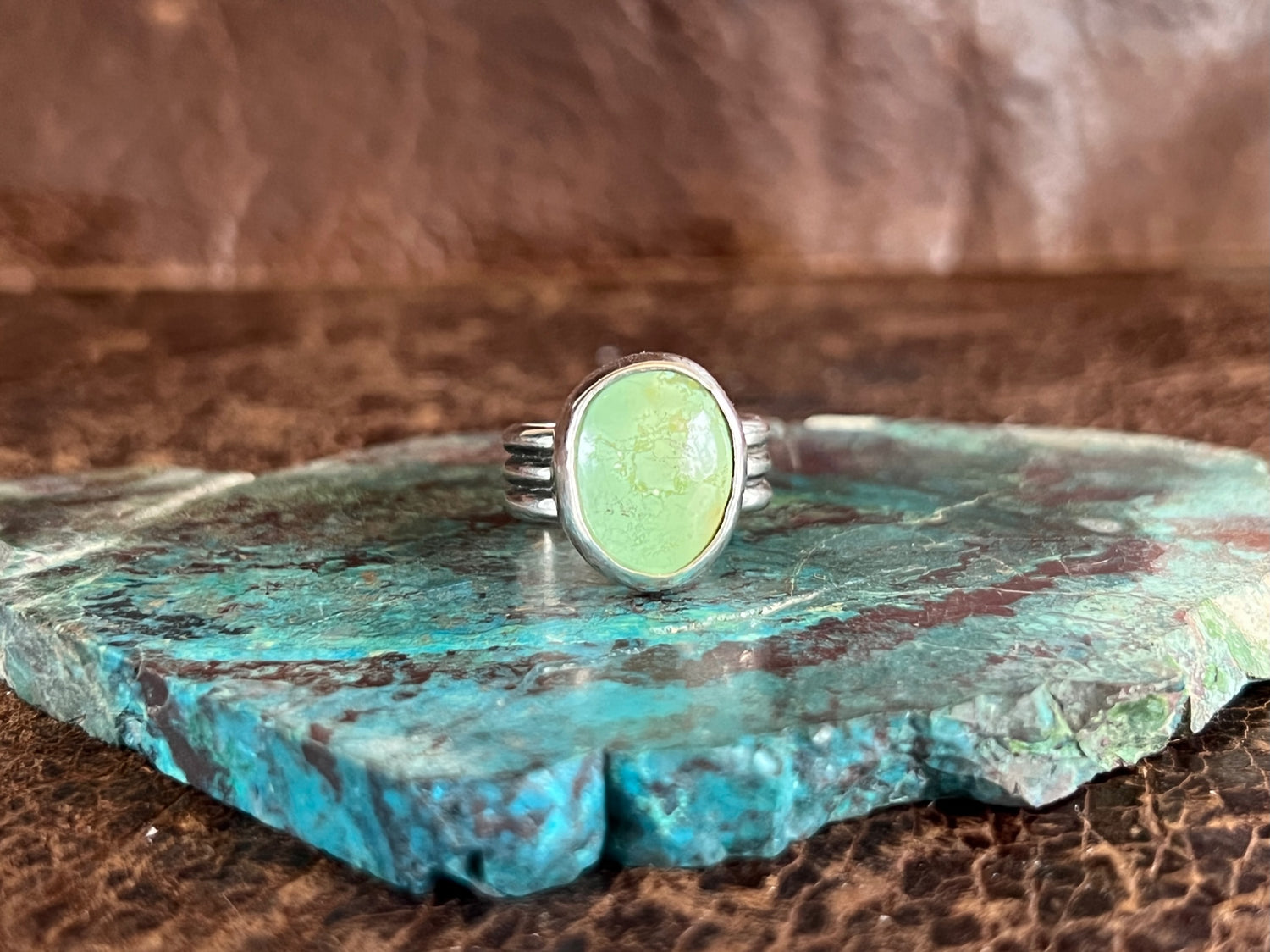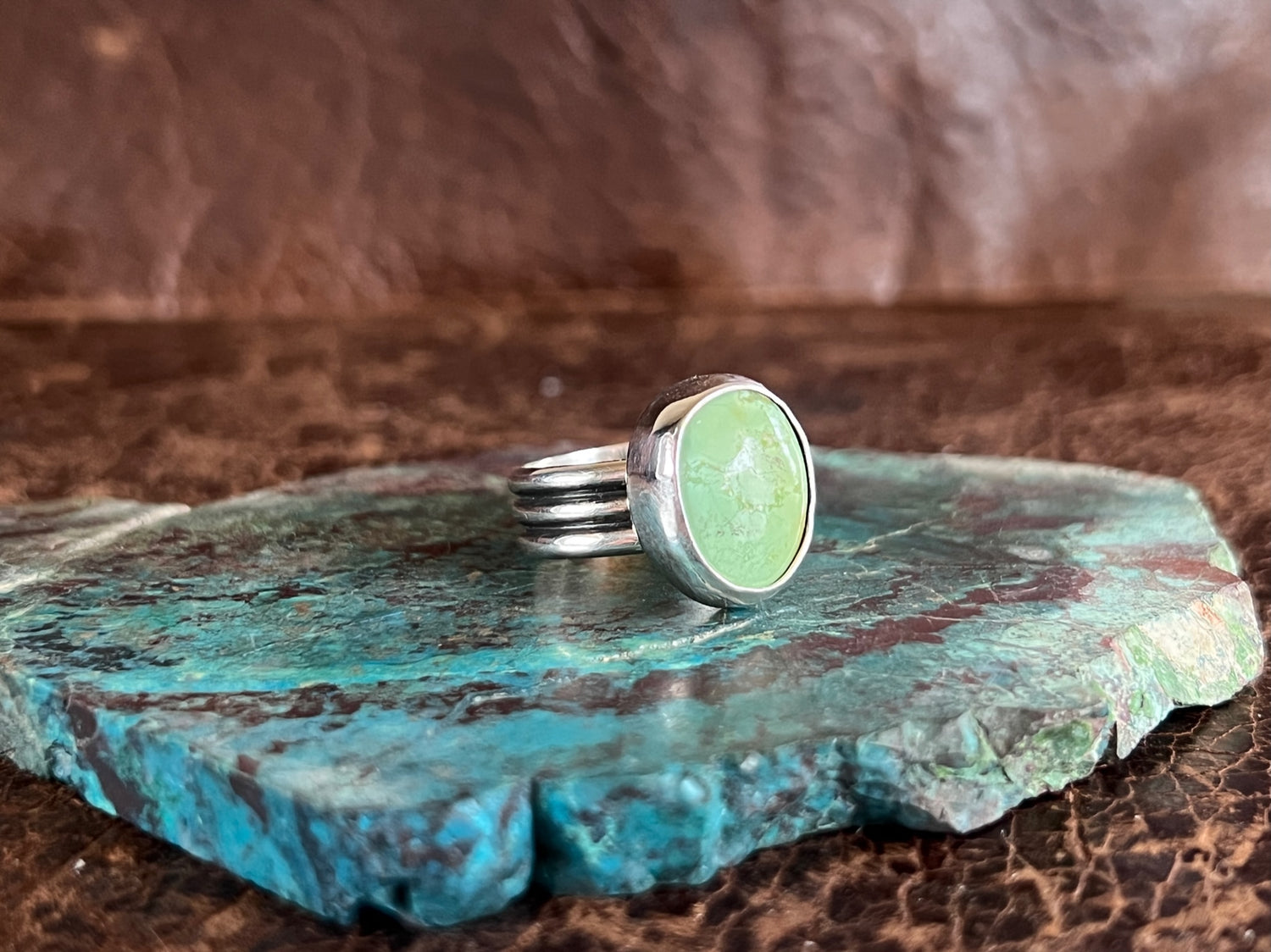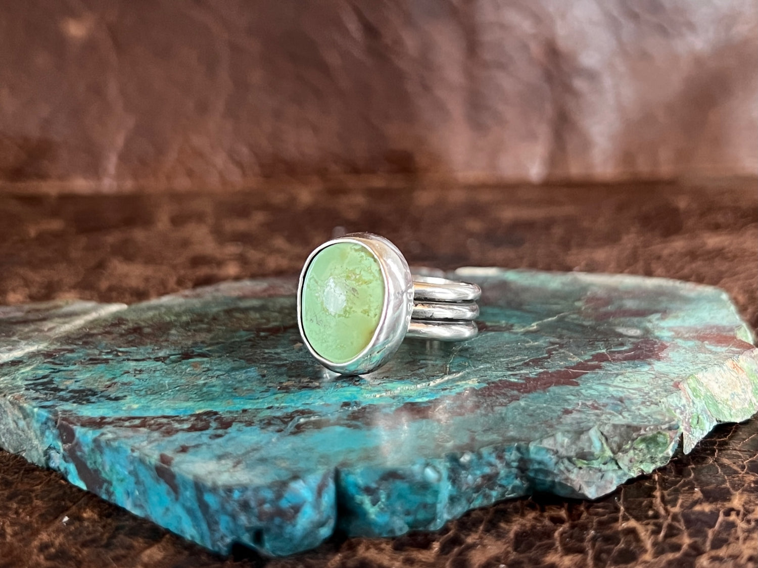 Hidden Valley Turquoise 3 Row Ring, set in sterling silver with smooth bezel. This simple, yet trendy design is comfortable to wear & is great worn alone, or for stacking!