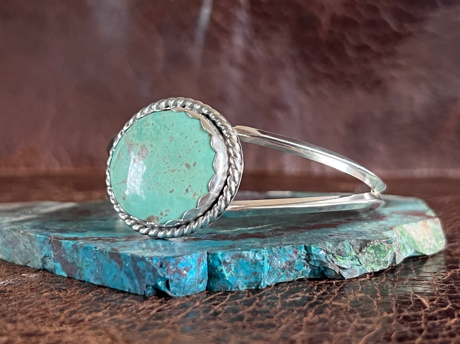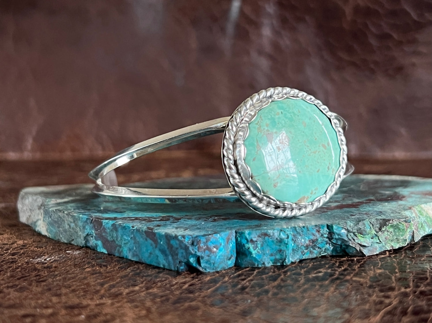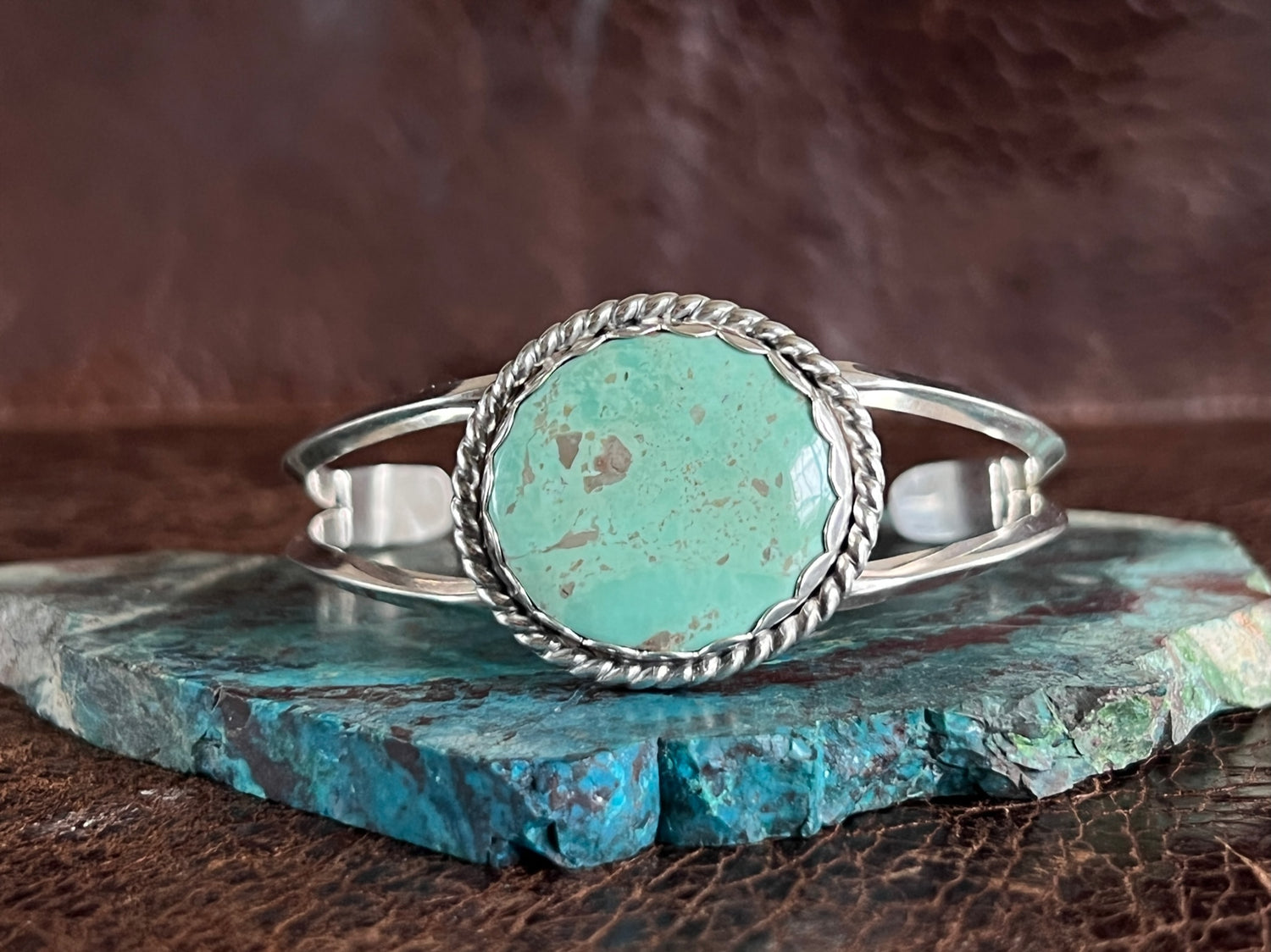 This dreamy mint green piece of Hidden Valley turquoise is the star of the show on this one! It's surrounded by a scalloped bezel & braided rope trim for perfect Southwestern Style look. It was made for a smaller wrist, so check out the measurements below.