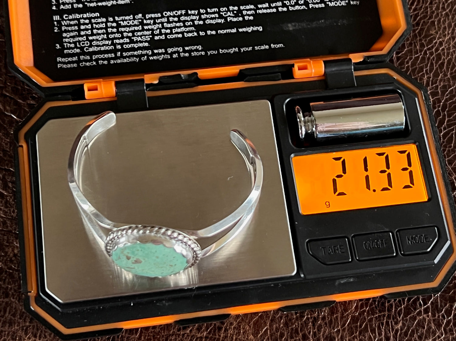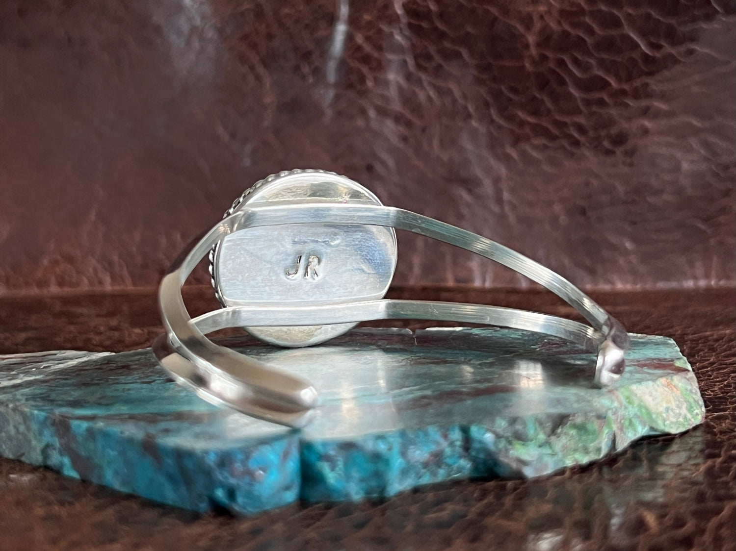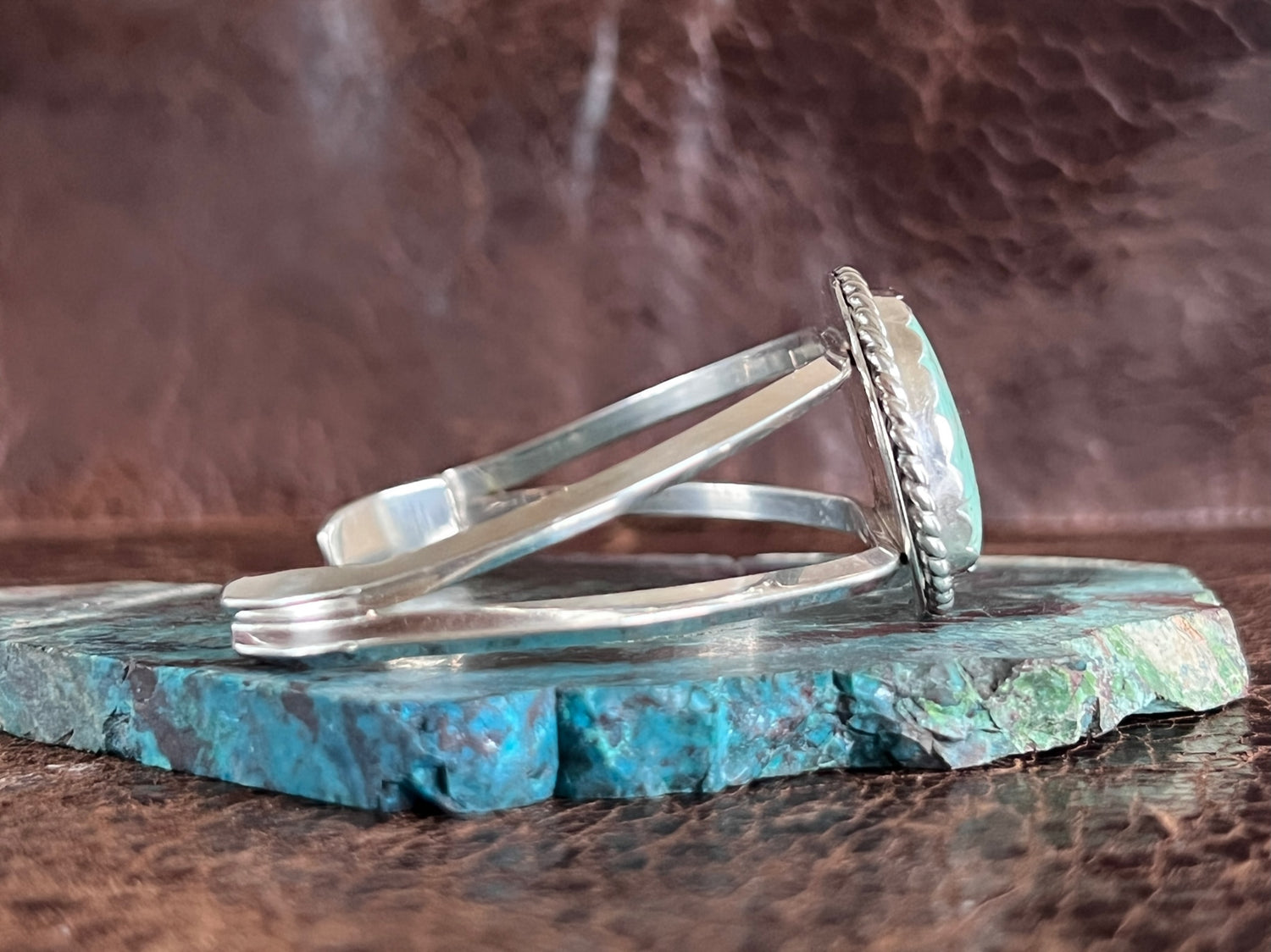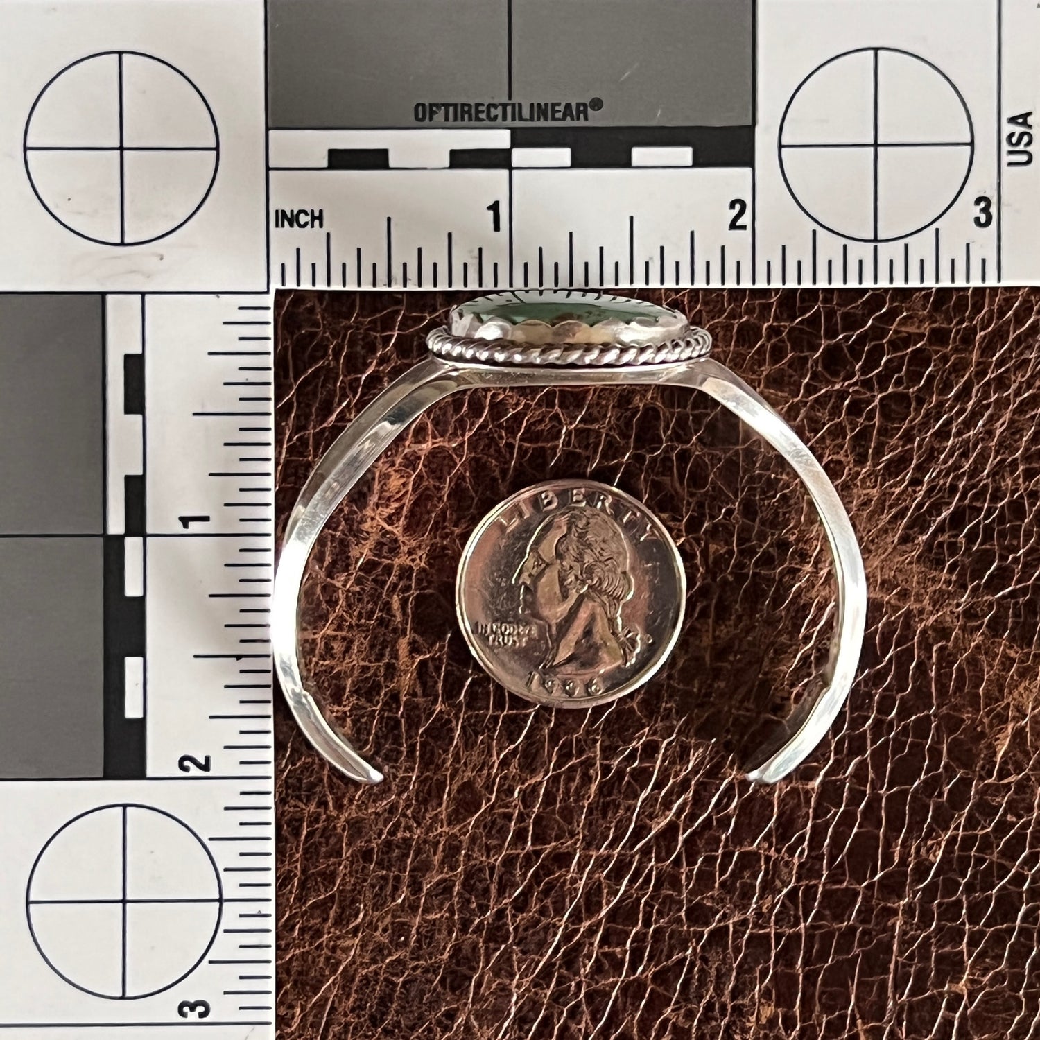 This dreamy mint green piece of Hidden Valley turquoise is the star of the show on this one! It's surrounded by a scalloped bezel & braided rope trim for perfect Southwestern Style look. It was made for a smaller wrist, so check out the measurements below.