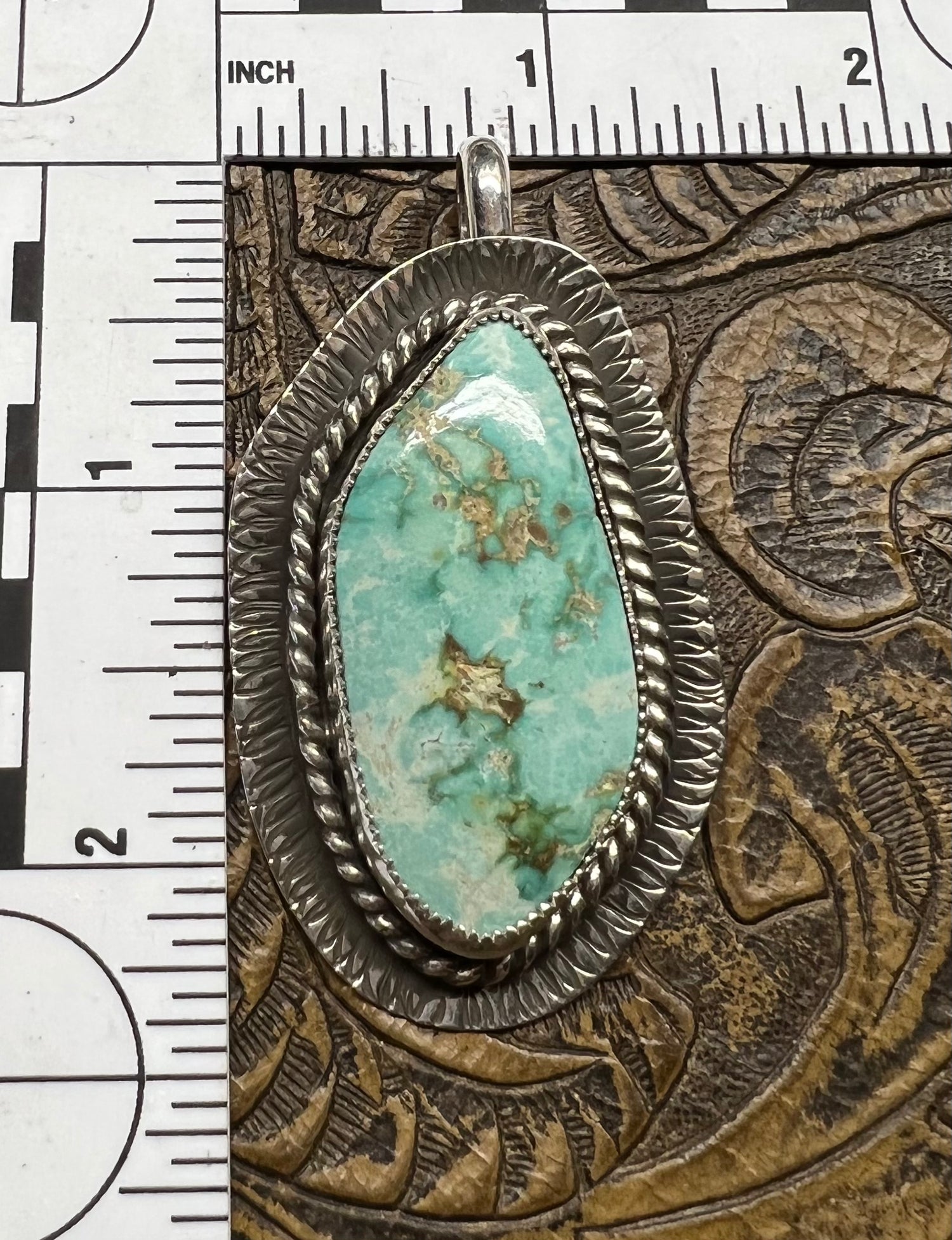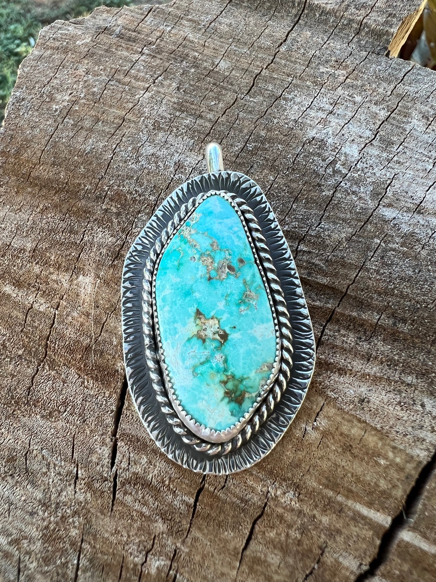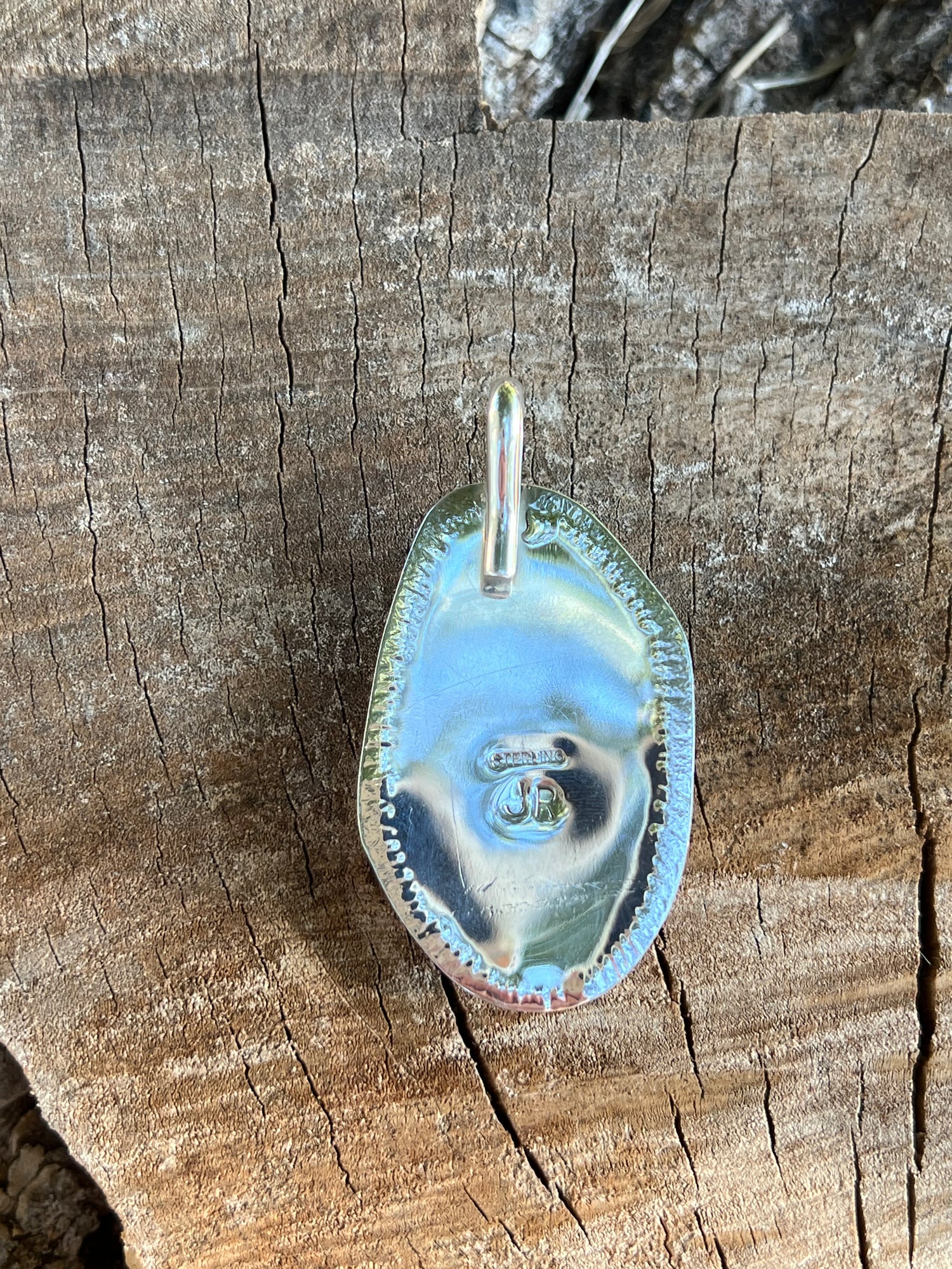 Mined in the mountains of Nevada, McGinnis turquoise has been known as “the gem”. The colors & matrix on this piece are just GORGEOUS. The stone is surrounded by a serrated bezel, heavy twist rope & a hand stamped border. The bail is a shepherd’s hook, which gives you the versatility to wear it on a chain or any beautiful beads/Navajo pearls that you would want. Here at Fresh Fire Trading: We love versatility!