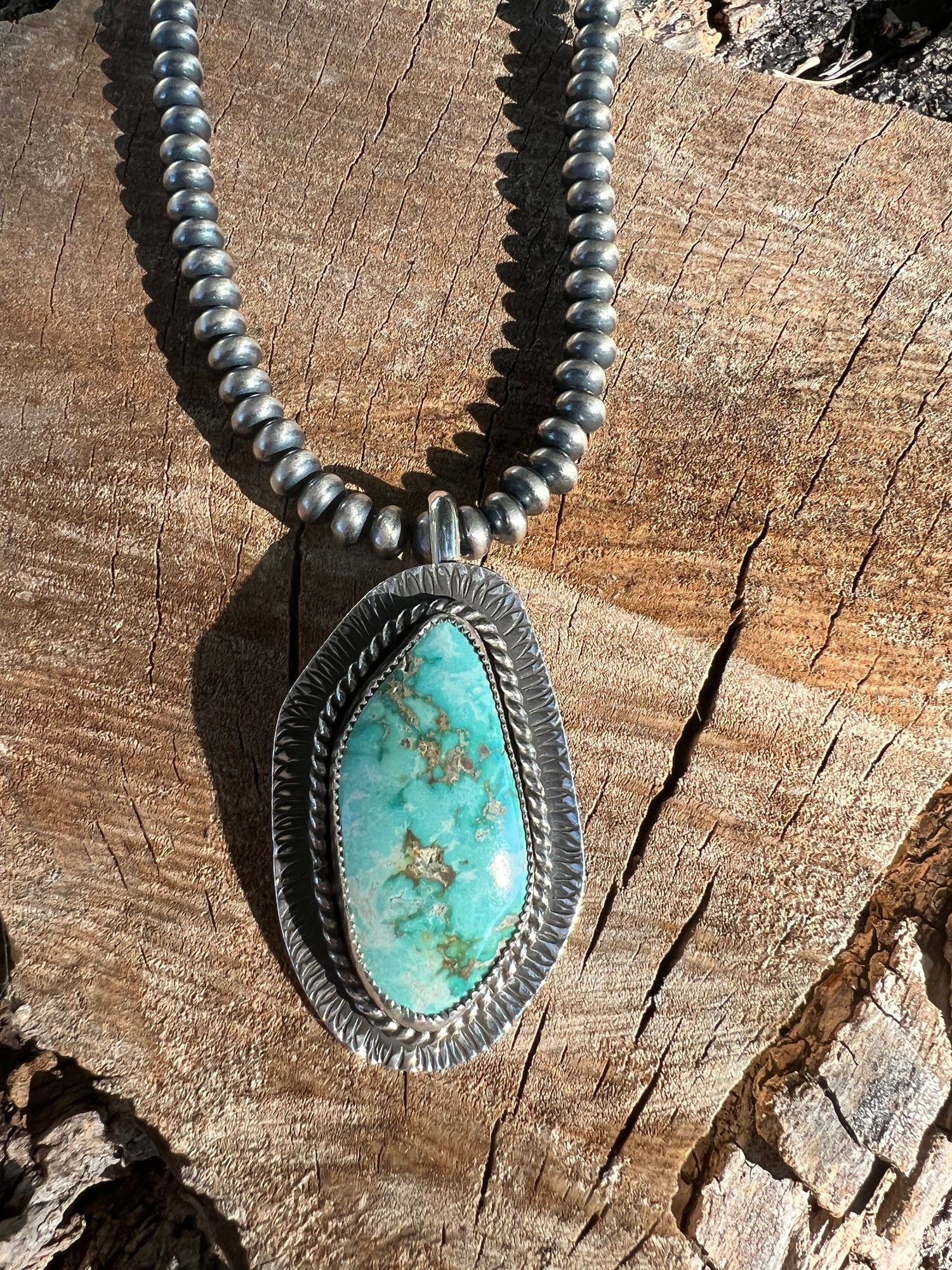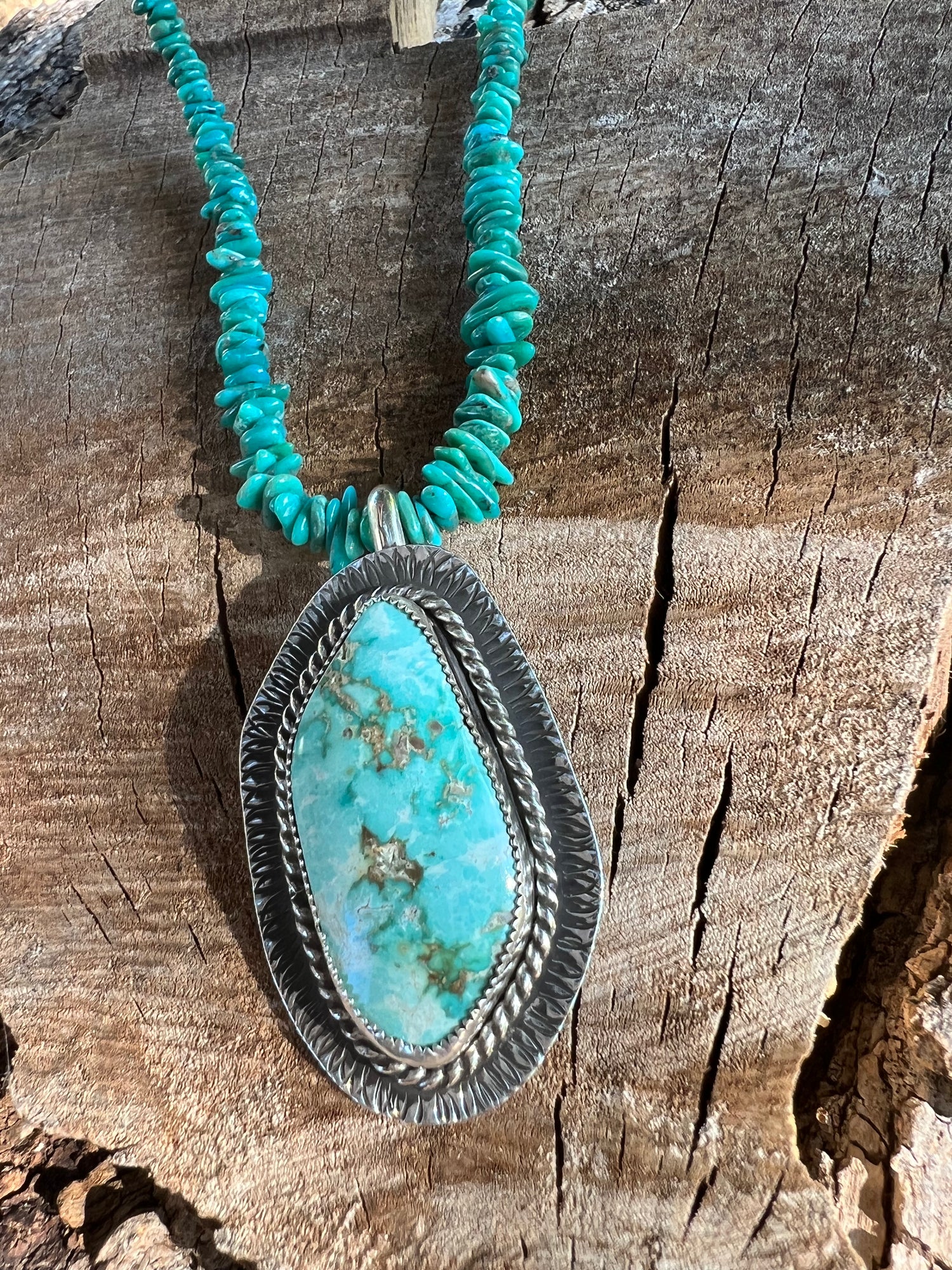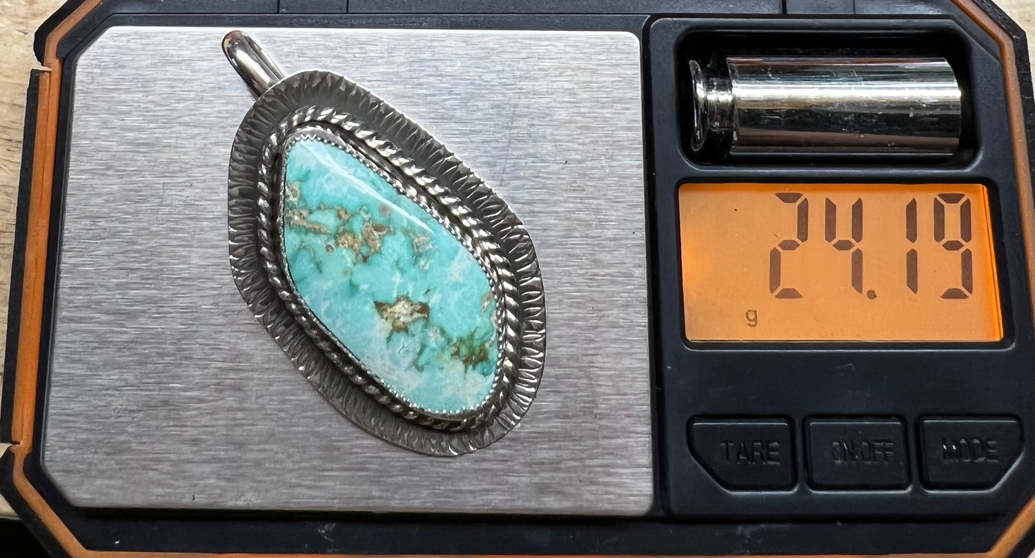 Mined in the mountains of Nevada, McGinnis turquoise has been known as “the gem”. The colors & matrix on this piece are just GORGEOUS. The stone is surrounded by a serrated bezel, heavy twist rope & a hand stamped border. The bail is a shepherd’s hook, which gives you the versatility to wear it on a chain or any beautiful beads/Navajo pearls that you would want. Here at Fresh Fire Trading: We love versatility!
