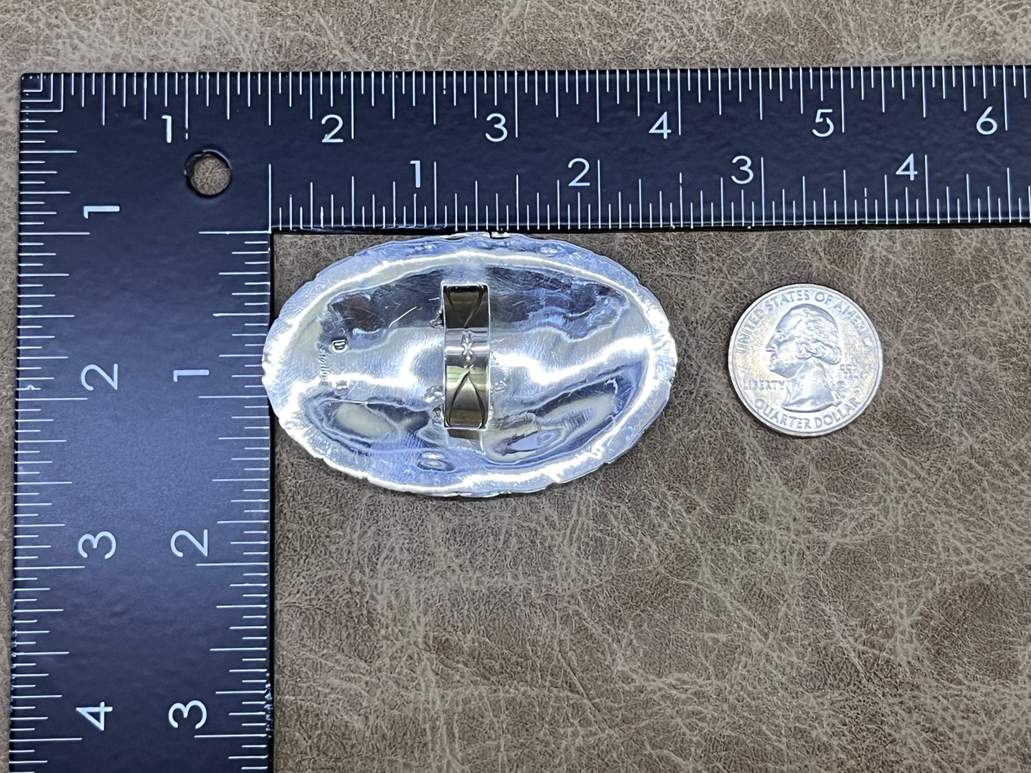 It features 16 beautiful blue stones, has beautiful hand stamped details around the bezel & also around the shank of the ring. The artist is Darlene Begay, Navajo.