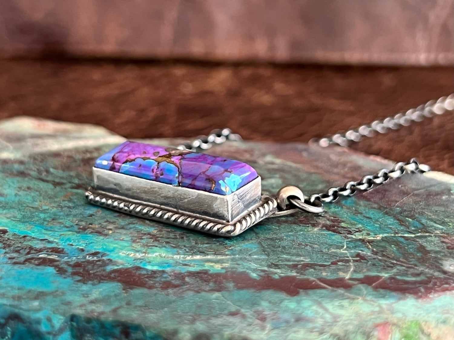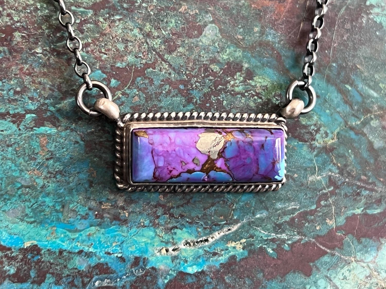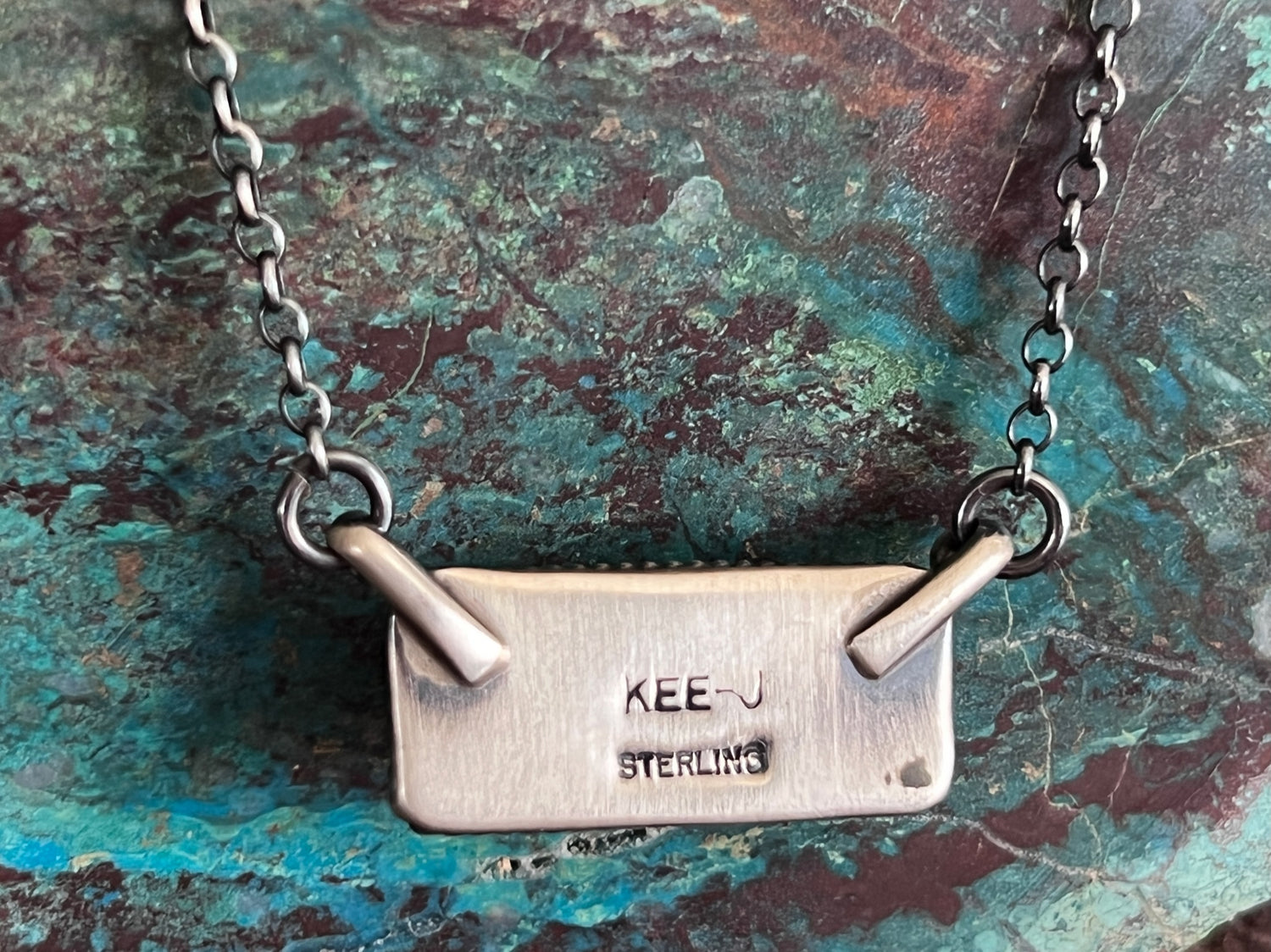 If you love purple: this one's for you! It features a beautiful Purple Mojave' Bronze metal & Turquoise Conglomerate stone. This stone is both unique & vibrant, also very popular right now! It hangs from a heavily oxidized sterling silver chain. Perfect for layering or wearing alone. It is Native American made & has the sterling stamp, along with the maker's hallmark: Kee-J.