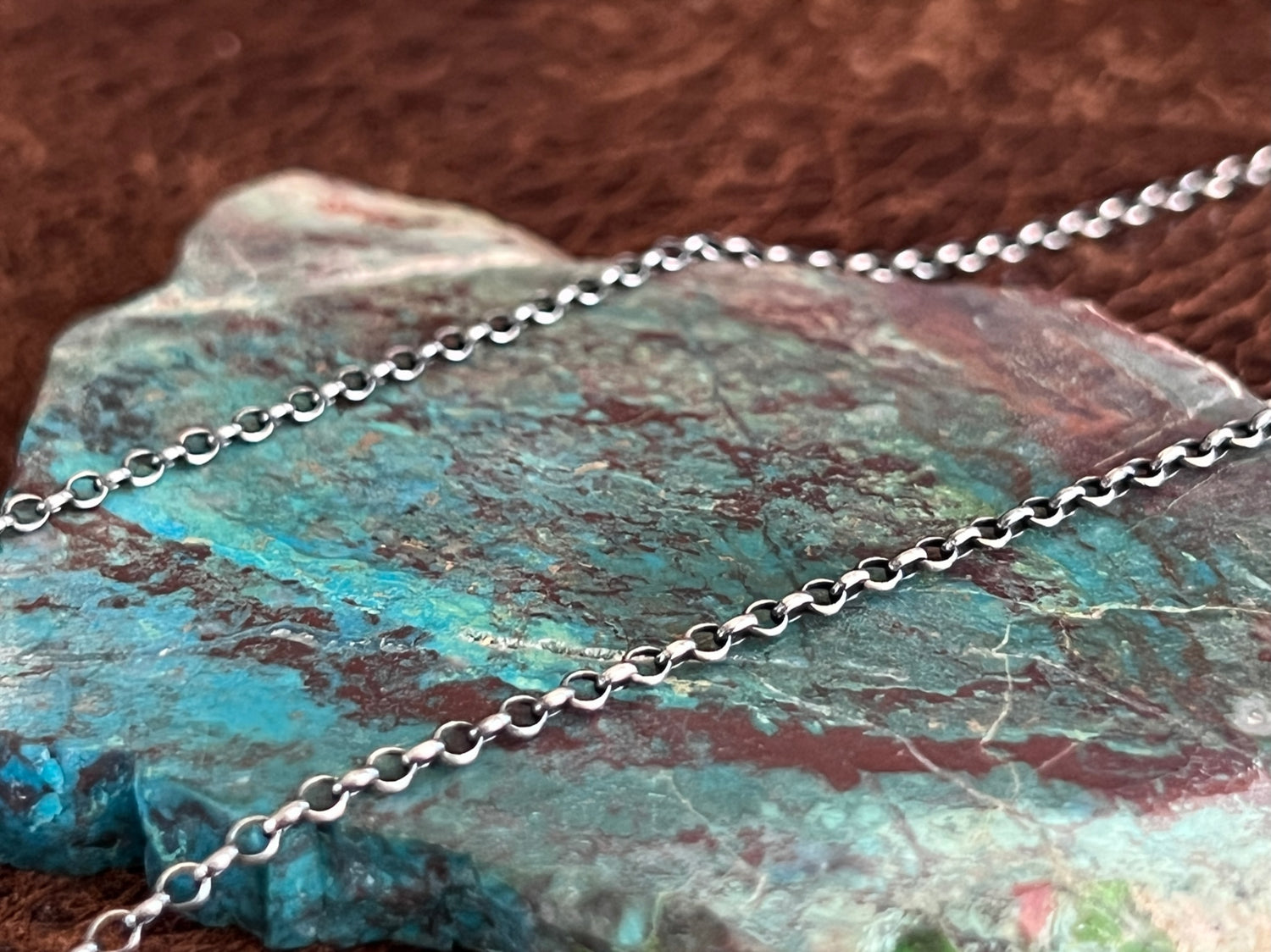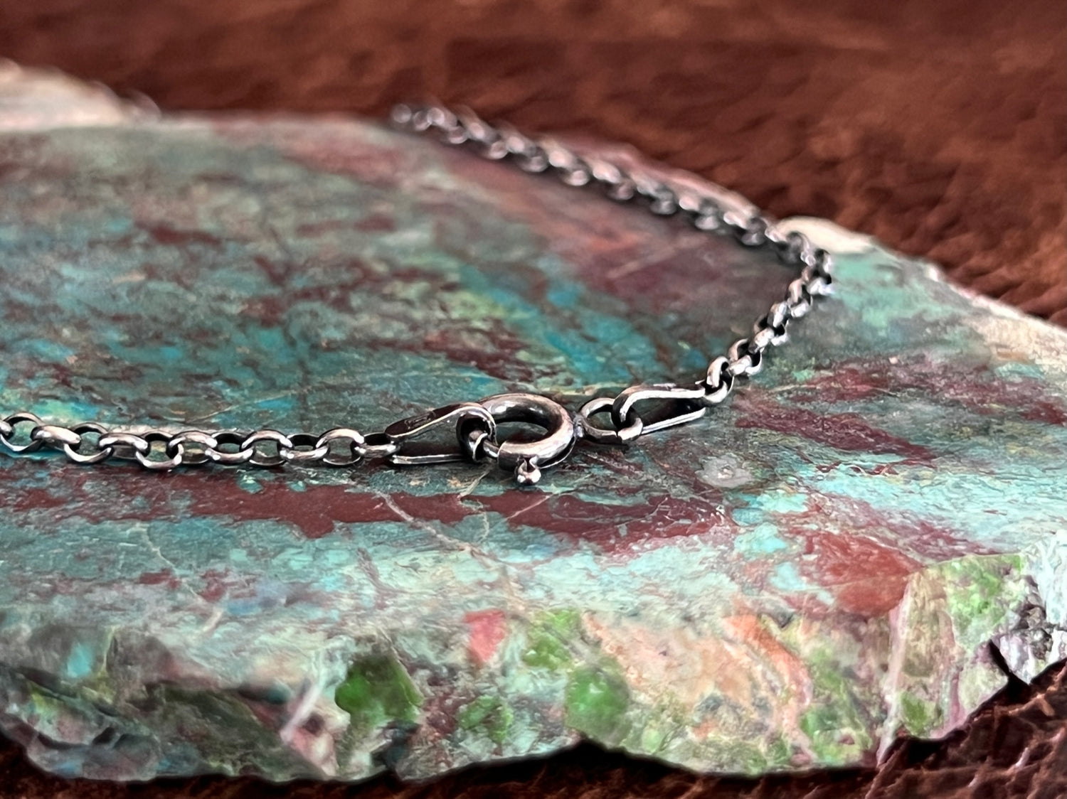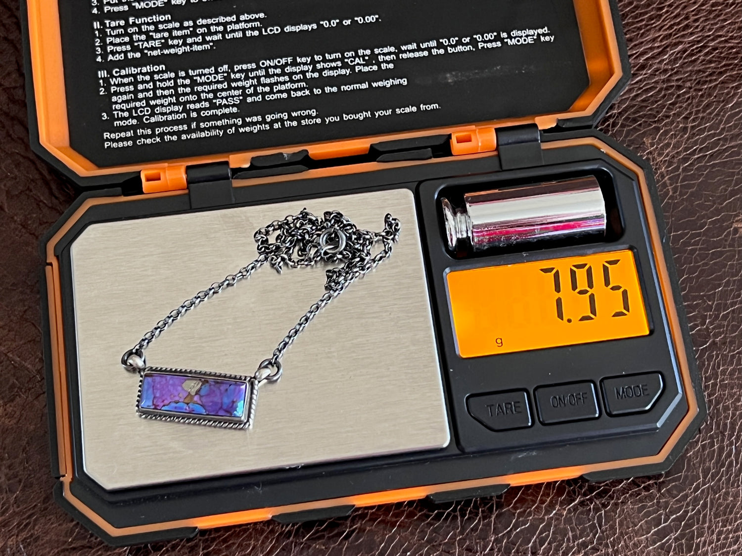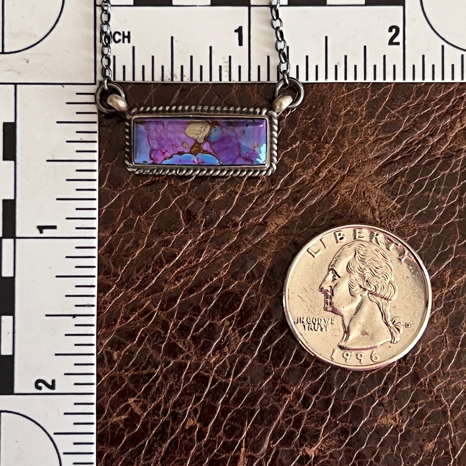If you love purple: this one's for you! It features a beautiful Purple Mojave' Bronze metal & Turquoise Conglomerate stone. This stone is both unique & vibrant, also very popular right now! It hangs from a heavily oxidized sterling silver chain. Perfect for layering or wearing alone. It is Native American made & has the sterling stamp, along with the maker's hallmark: Kee-J.