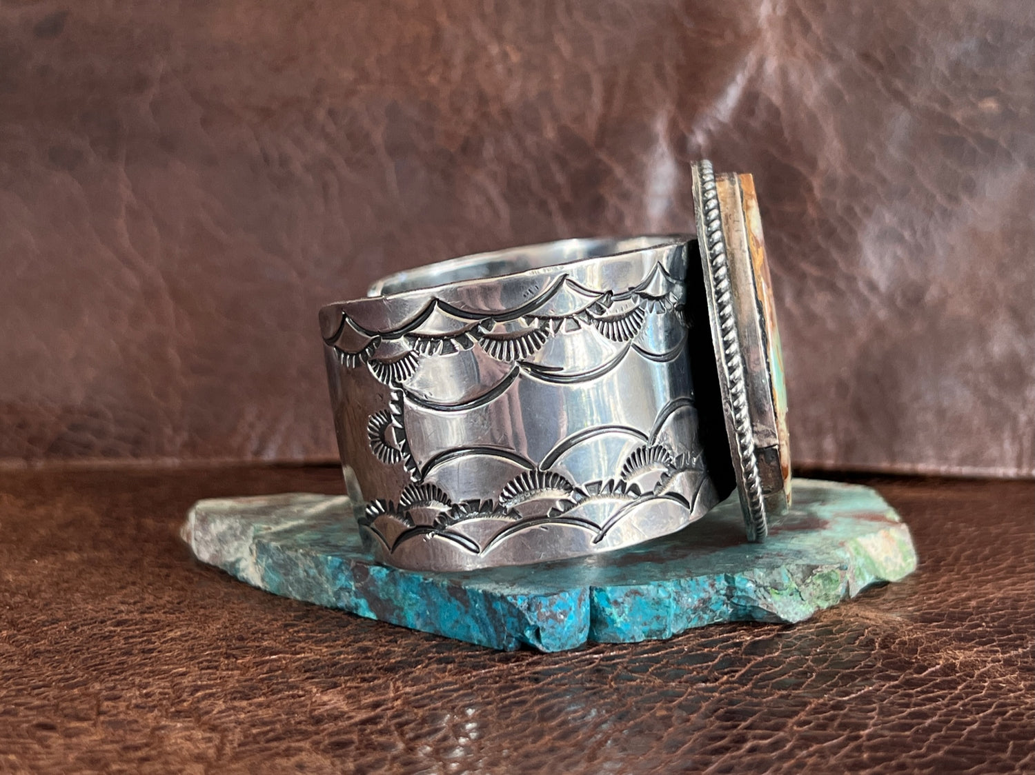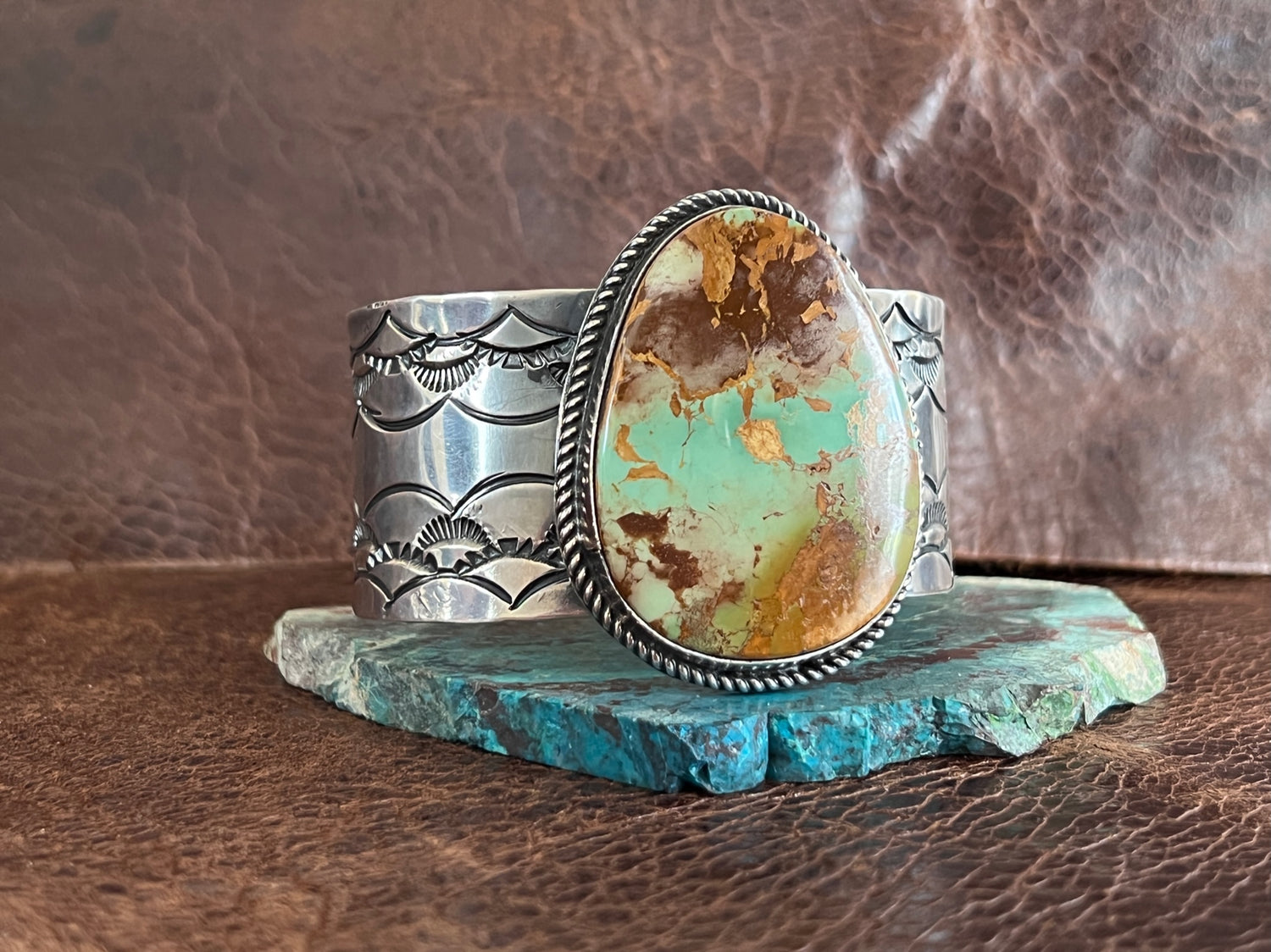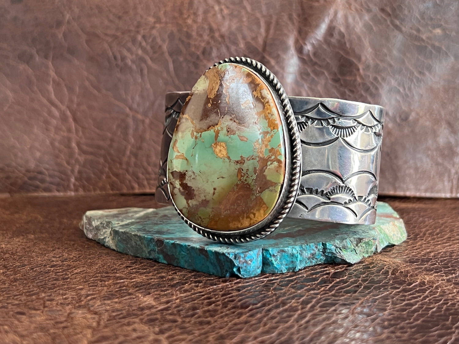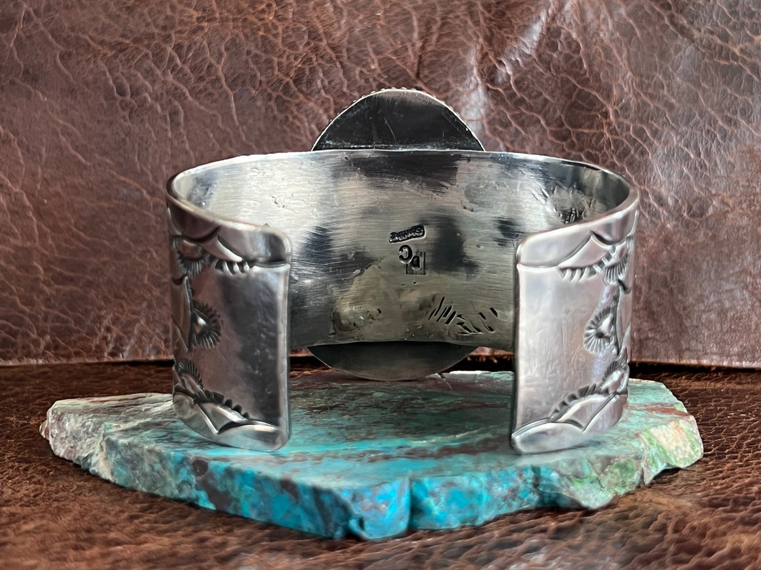 What a fantastic Large Royston Cuff bracelet by Navajo Artist Damian Cotton! The stone speaks for itself, it is GORGEOUS! It's set on a heavy gauge sterling cuff & hand stamped. Stamped sterling inside & has the maker's hallmark. The oxidation really accentuates this stunner