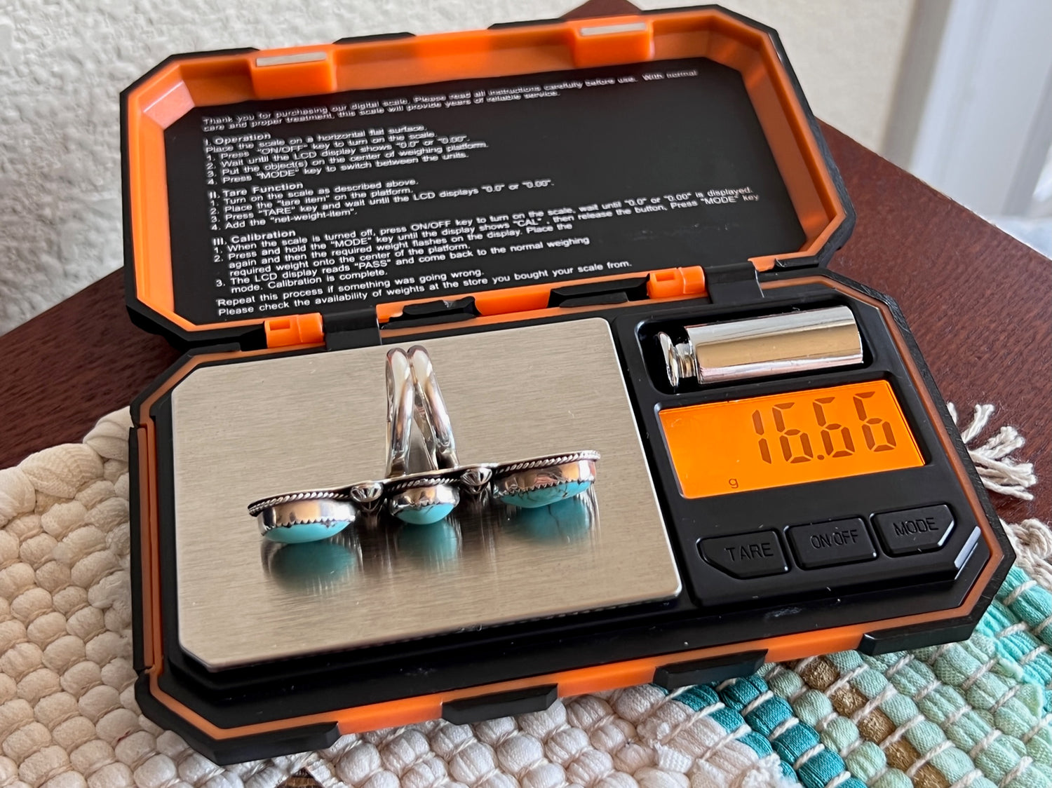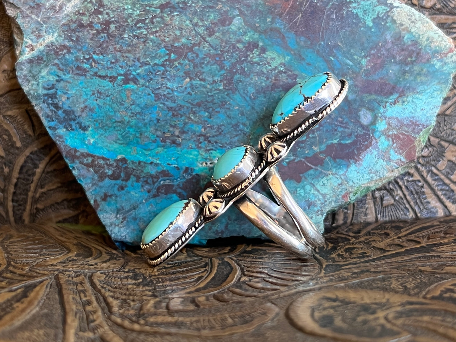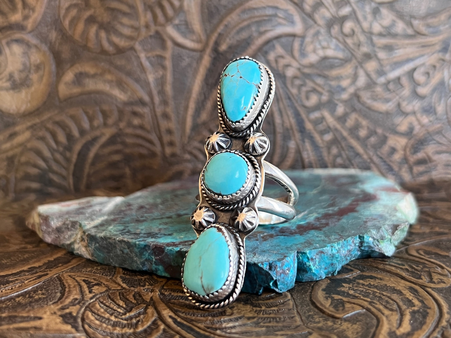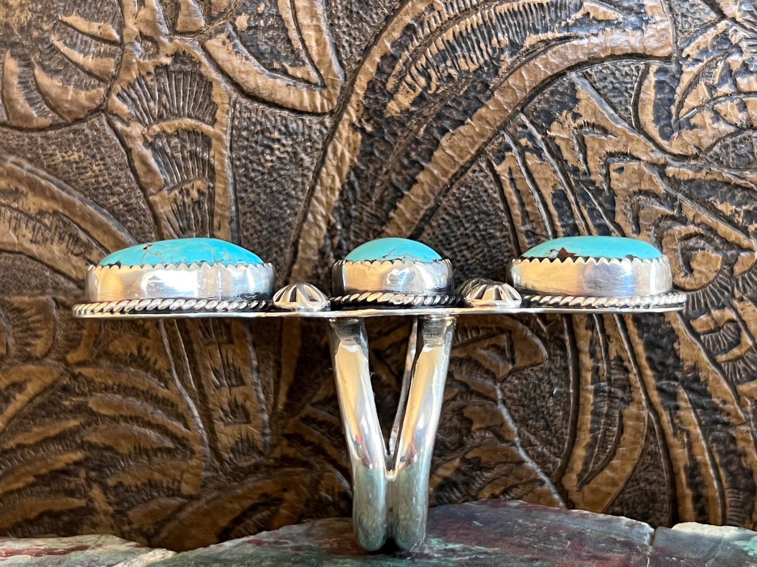 This 3 stone turquoise ring has the perfect combination of style & comfort. It has a great medium weight to it & you will want to wear it every day. The beautiful blue turquoise has brown matrix peeping through in various places & the 4 star shots, twisted rope & serrated bezels give it the familiar southwest style! It has a double split shank band & it very comfortable to wear.