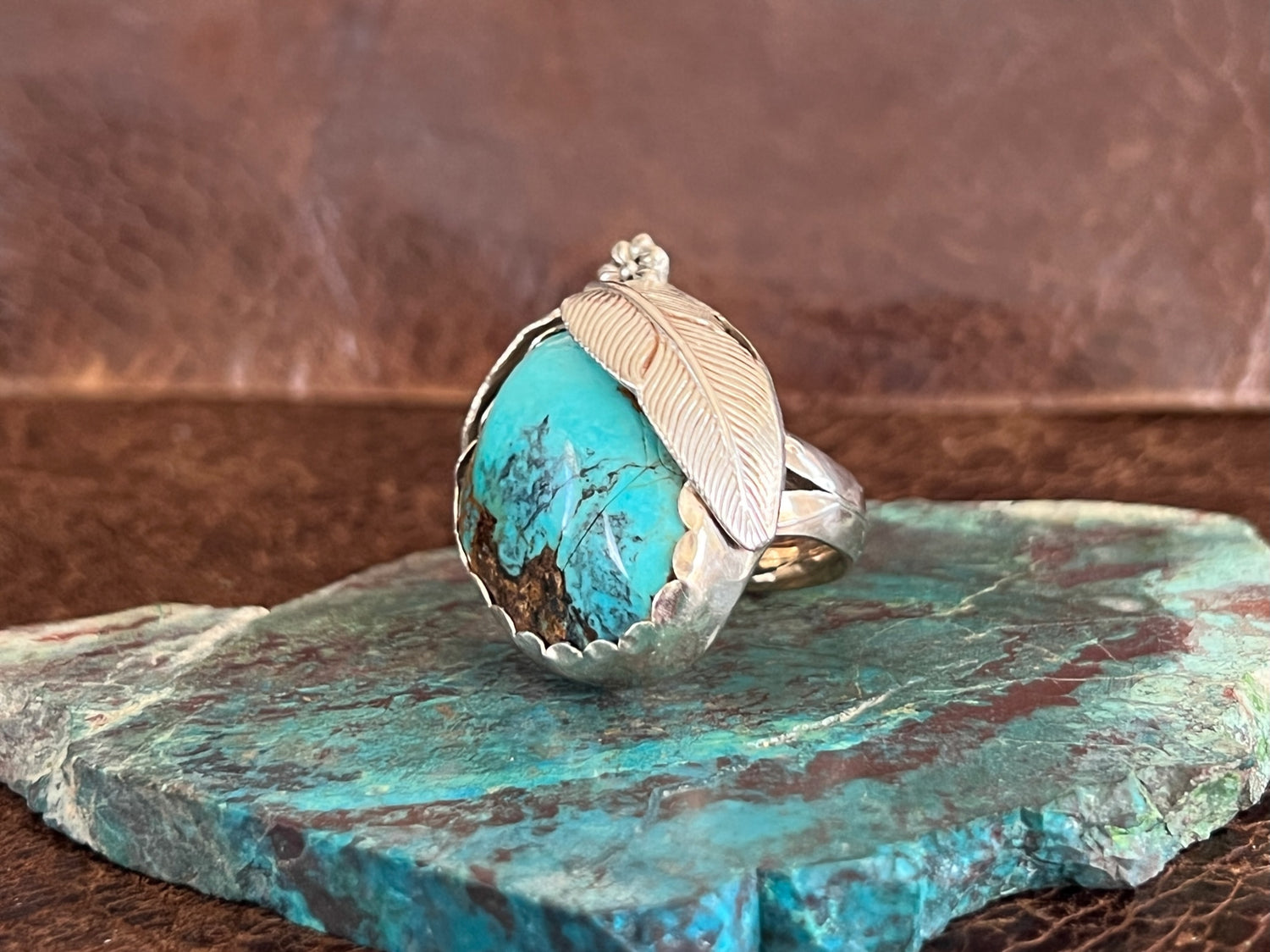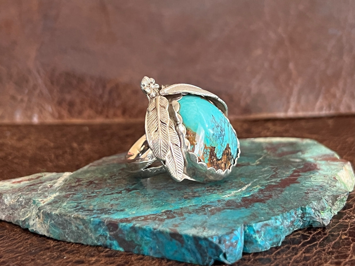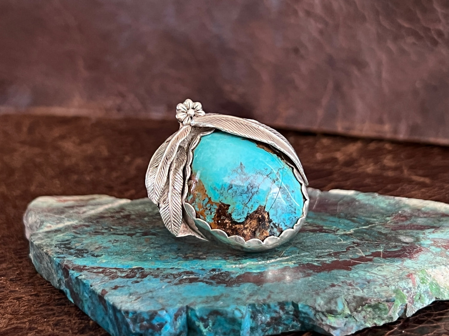 This is an artisan made turquoise ring. The feathers & flower are the perfect addition & compliment the stone beautifully. This ring is a great weight & is comfortable to wear.