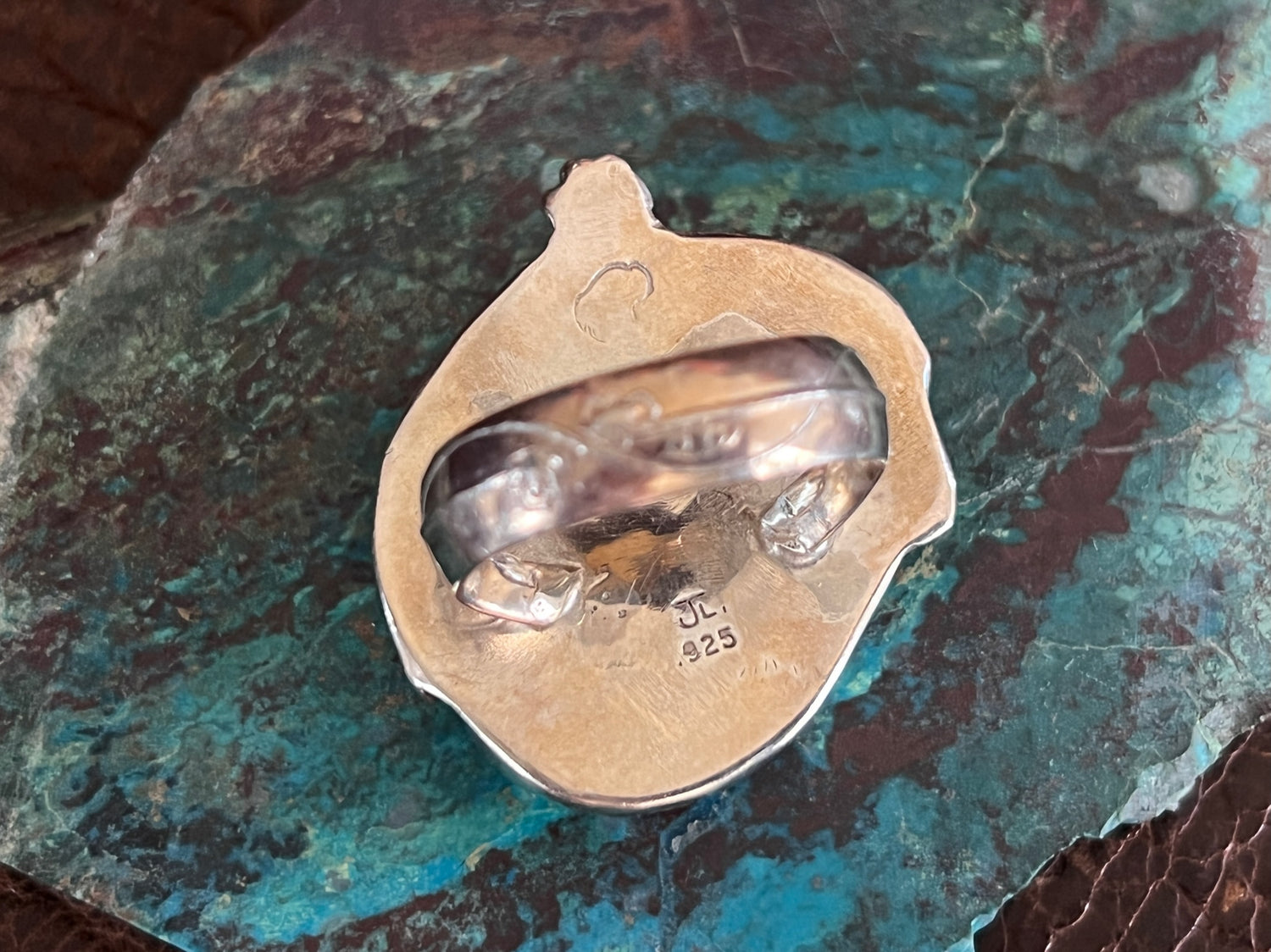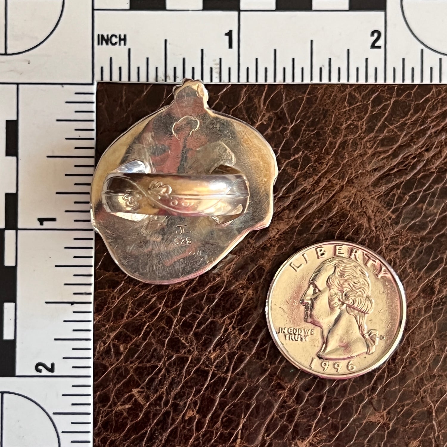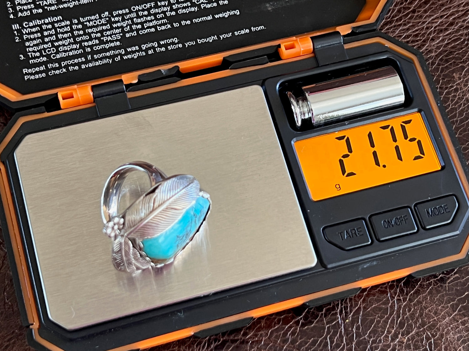 This is an artisan made turquoise ring. The feathers & flower are the perfect addition & compliment the stone beautifully. This ring is a great weight & is comfortable to wear.