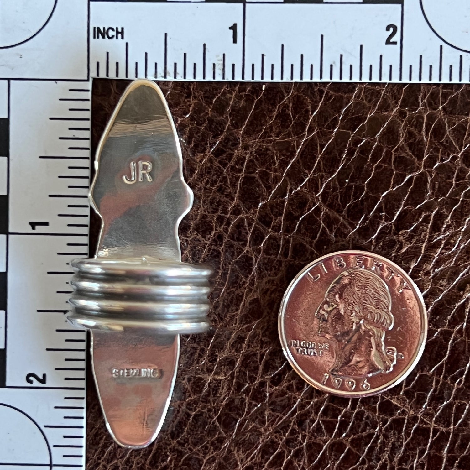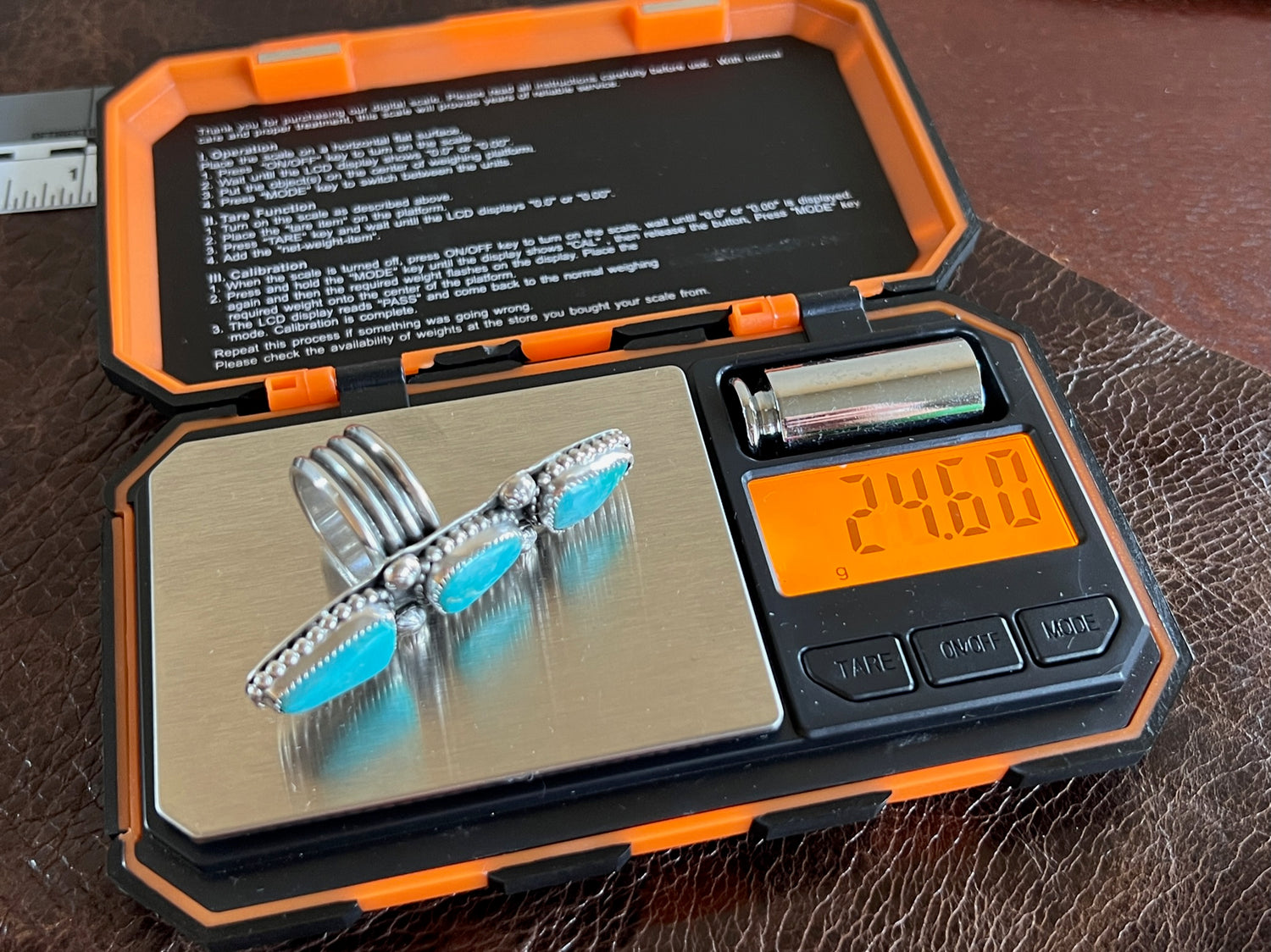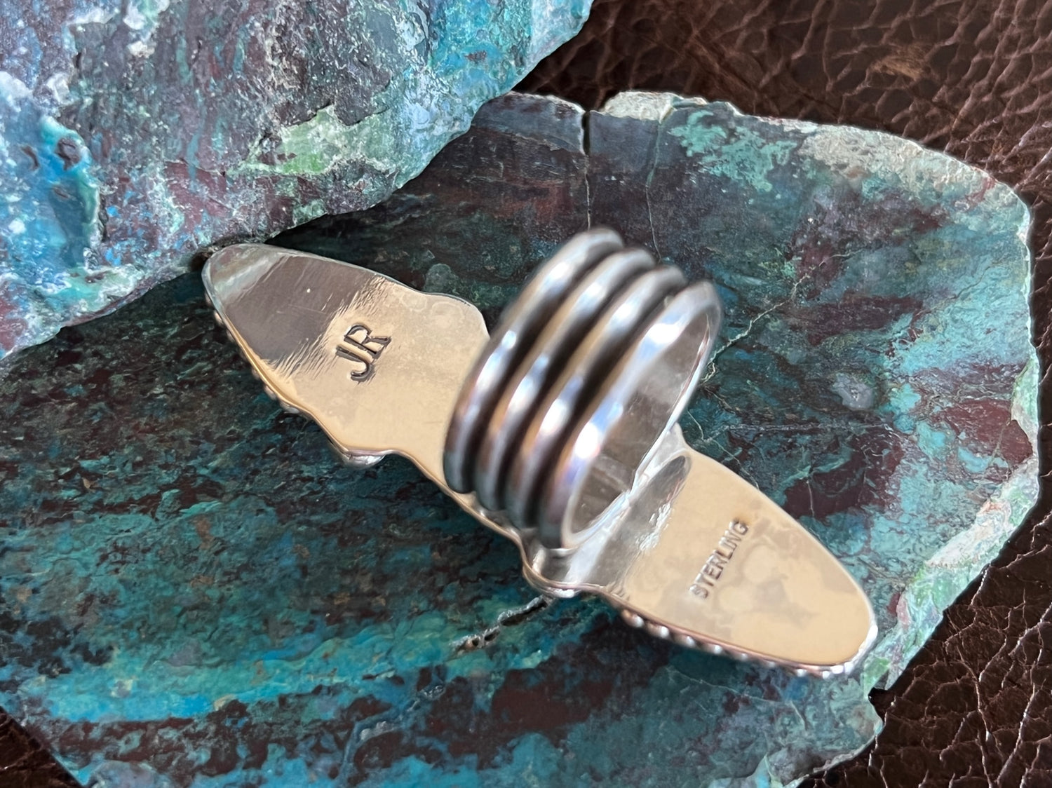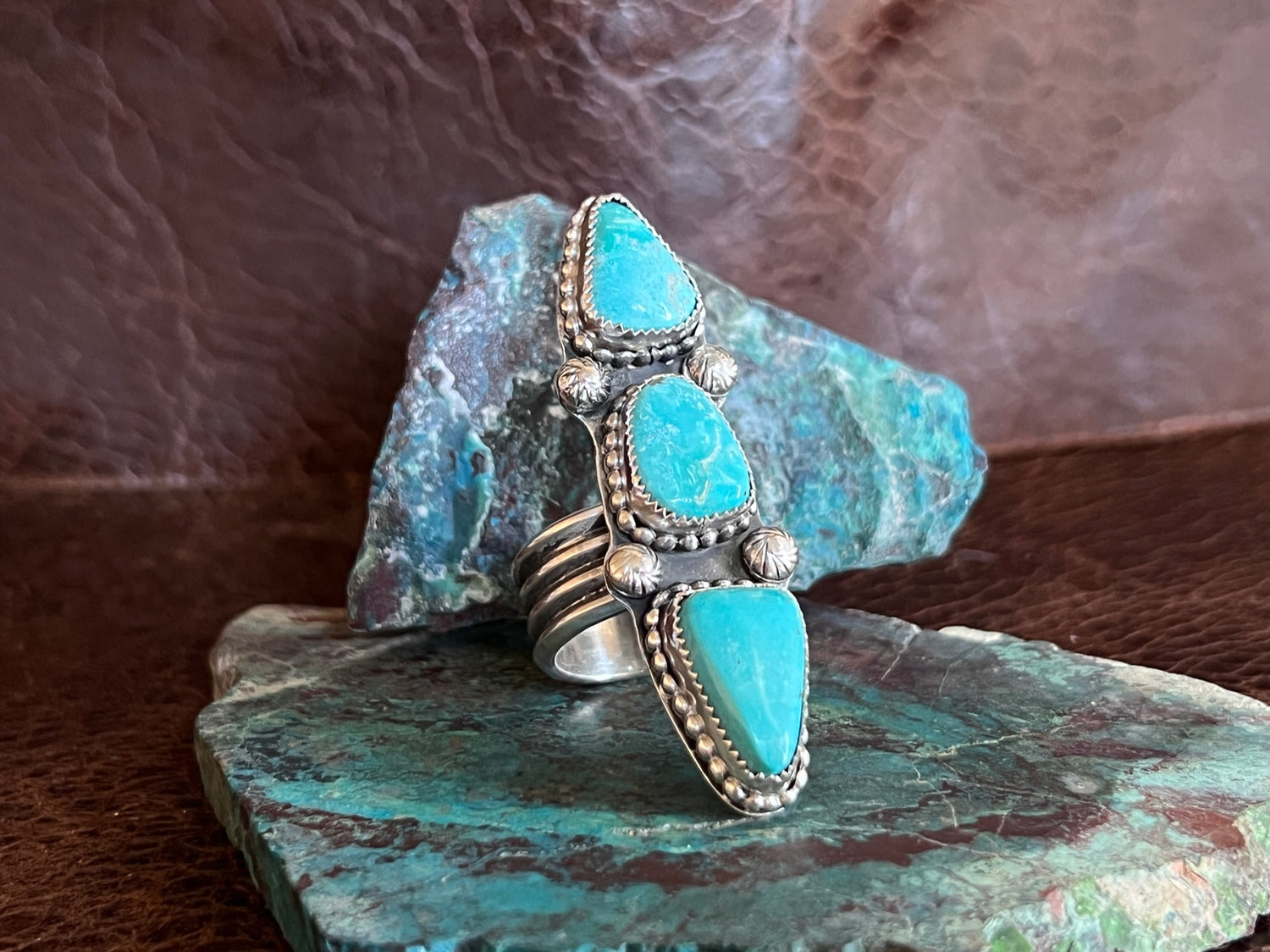 The blue free form turquoise stones in this ring are beautifully complimented by the bead trim around them. The hand-stamped beads also add the familiar southwest flair. The wide 4 row heavy gauge band on this ring is substantial, yet comfortable to wear. The shank is set just below center to make it more comfortable when wearing. This is definitely a statement ring!