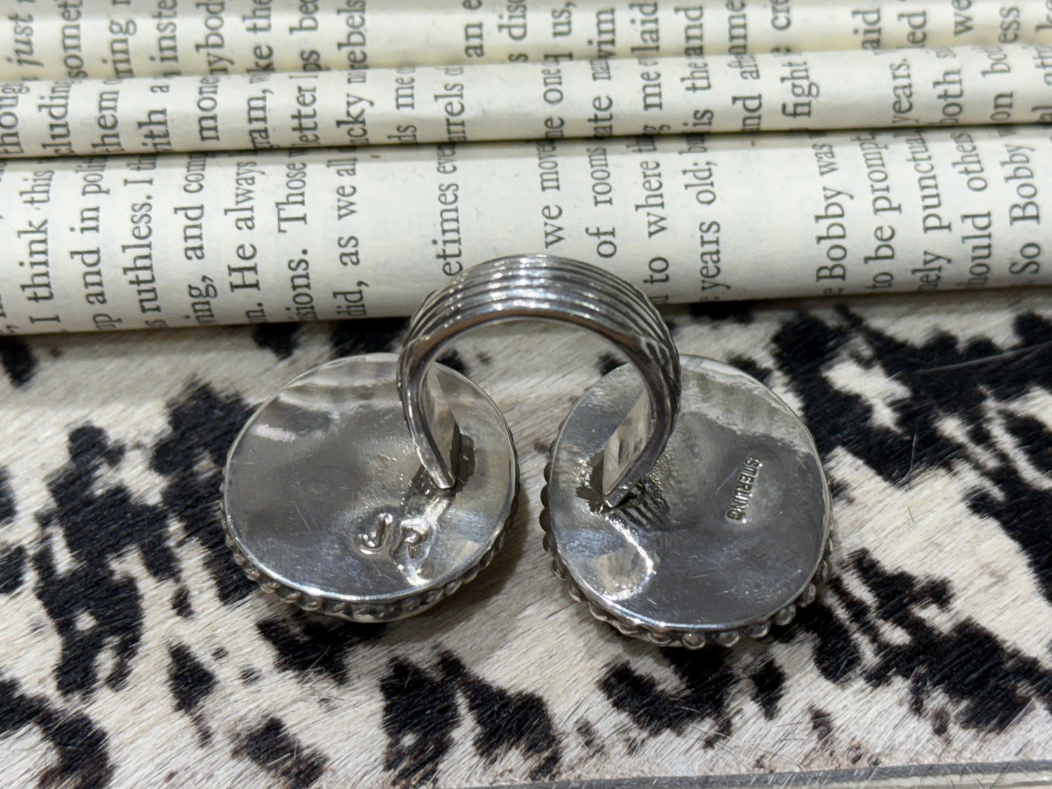 This two-stone beauty is an original design of Judy @ Fresh Fire Trading & features beautiful blackjack & Royston Turquoise framed by twisted & bead wire! The band is very thick, and goes beautifully with the design of the ring.