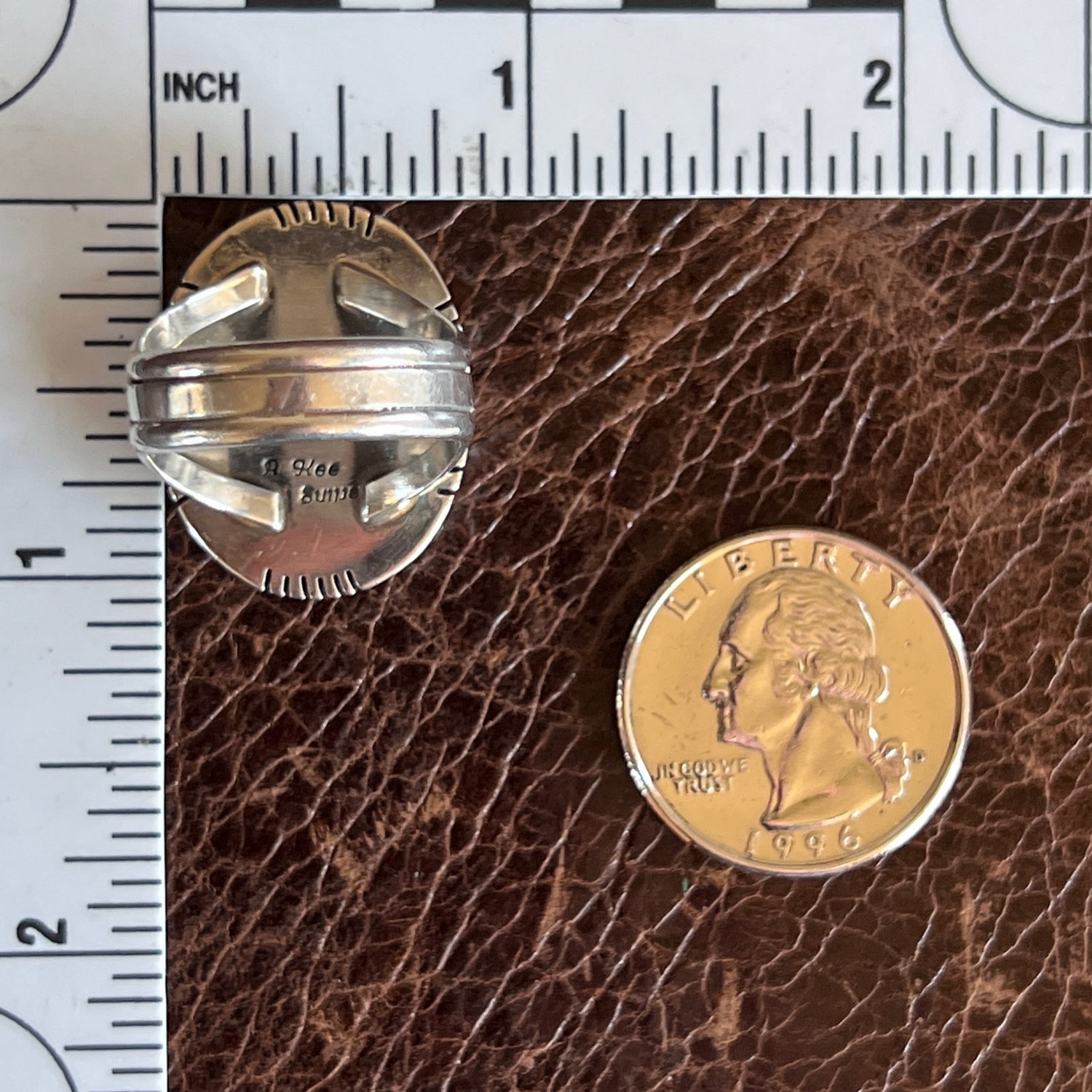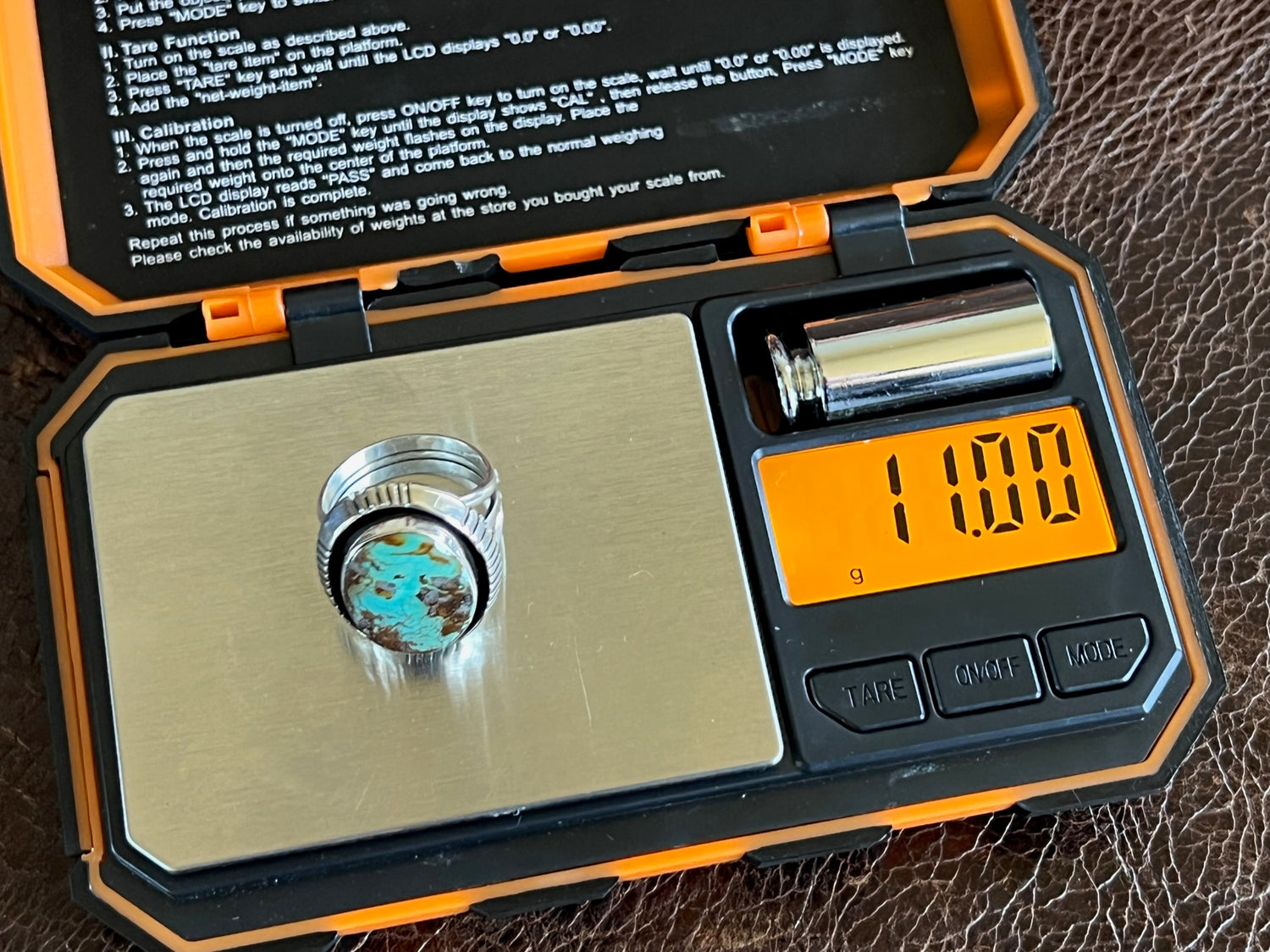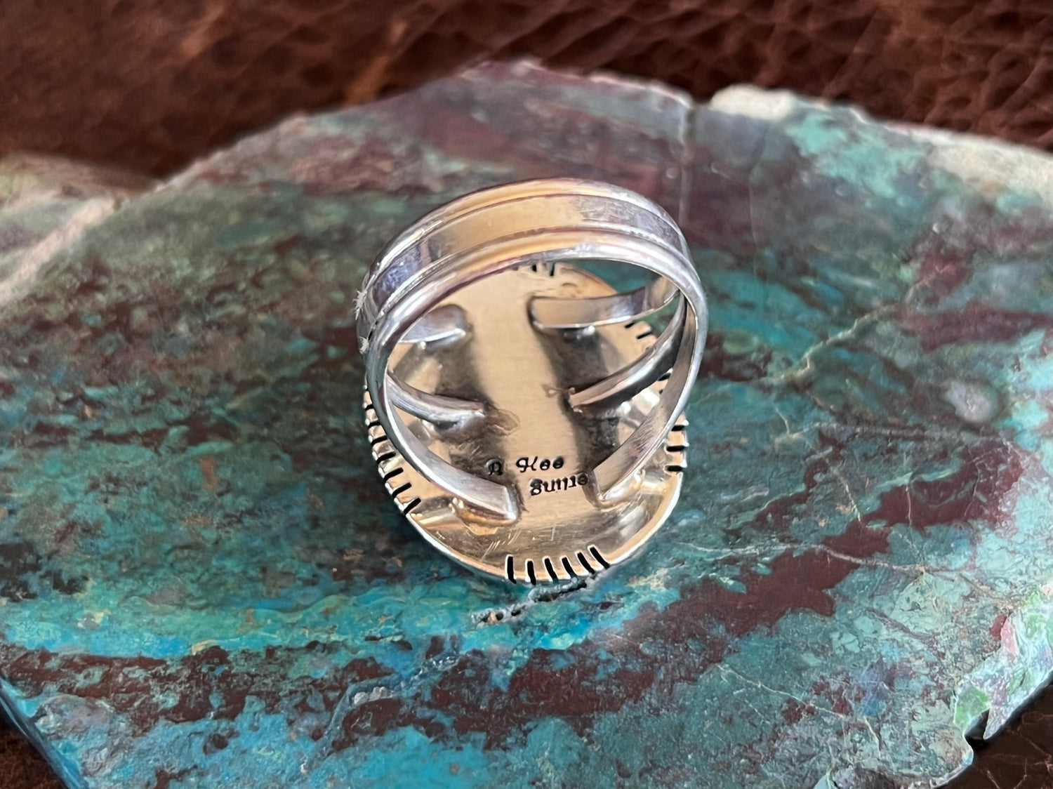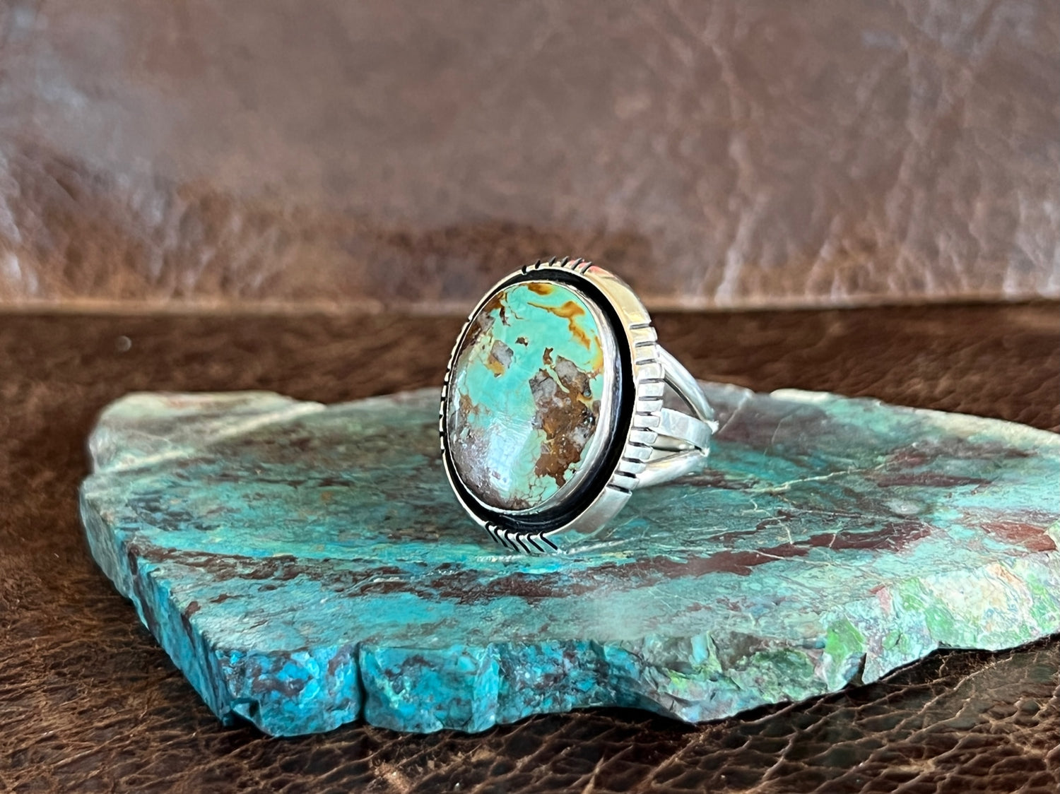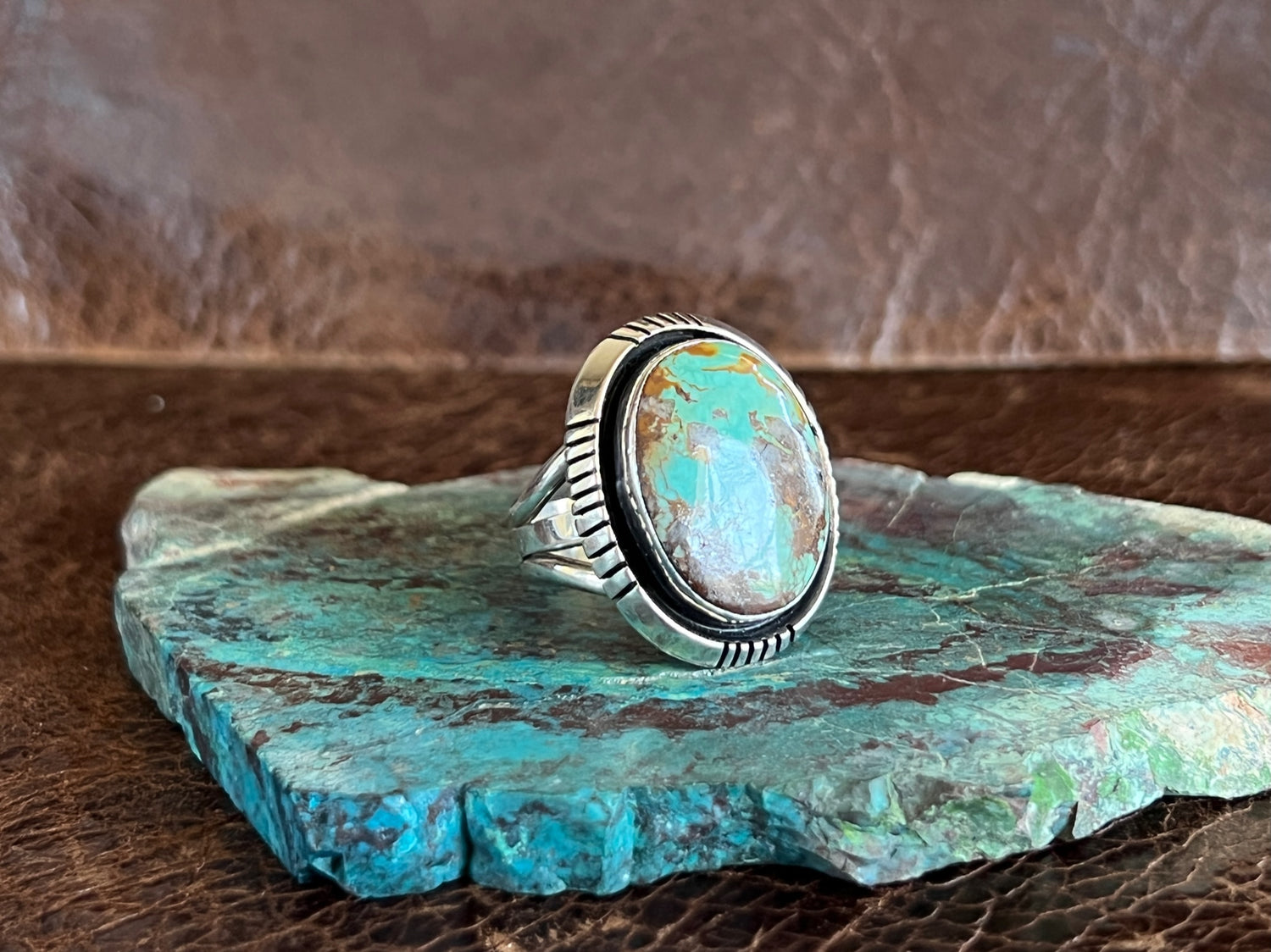 Vintage Green Turquoise Ring. Features a beautiful green turquoise with brown matrix, surround by heavier gauge hand cut triangle wire. The 3 row shank also adds an extra design element! What's not to love about this one?!? It is suitable to be worn by both male & female. It is stamped sterling & has the artist's hallmark: P Kee.