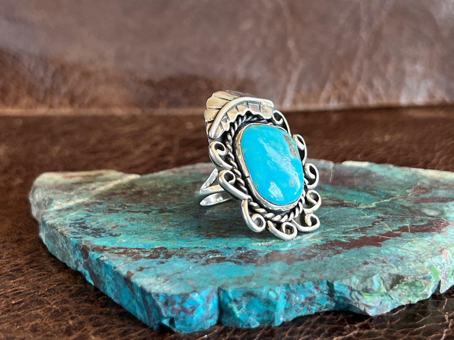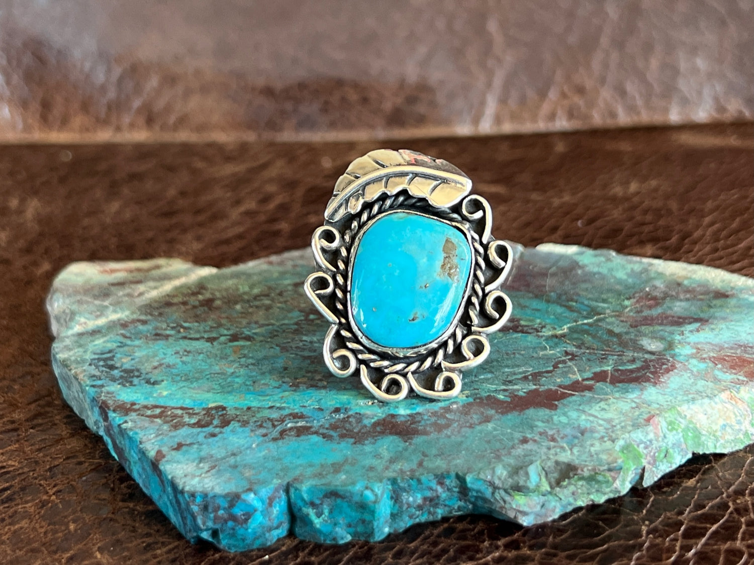 This a vintage beautiful blue turquoise ring! It has the traditional Native American style, but is not stamped with the maker's hallmark. The twisted wire, wire designs & sterling handmade feather make this a beautiful ring to wear! Tested as sterling. Artist unknown.