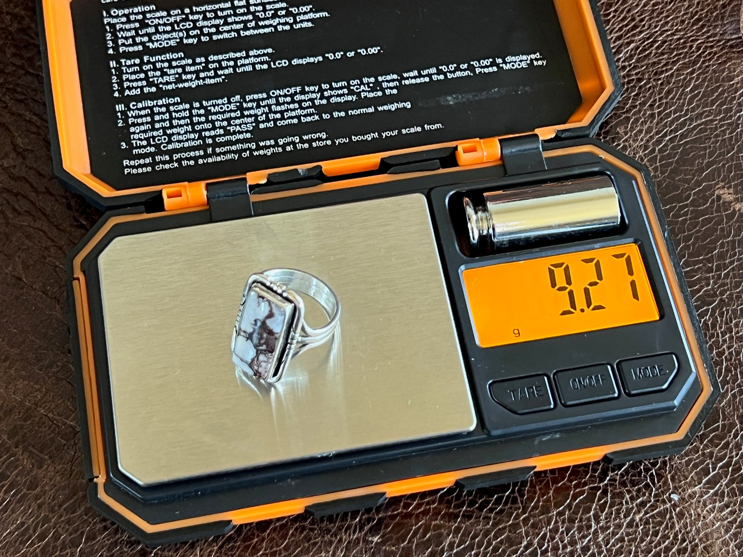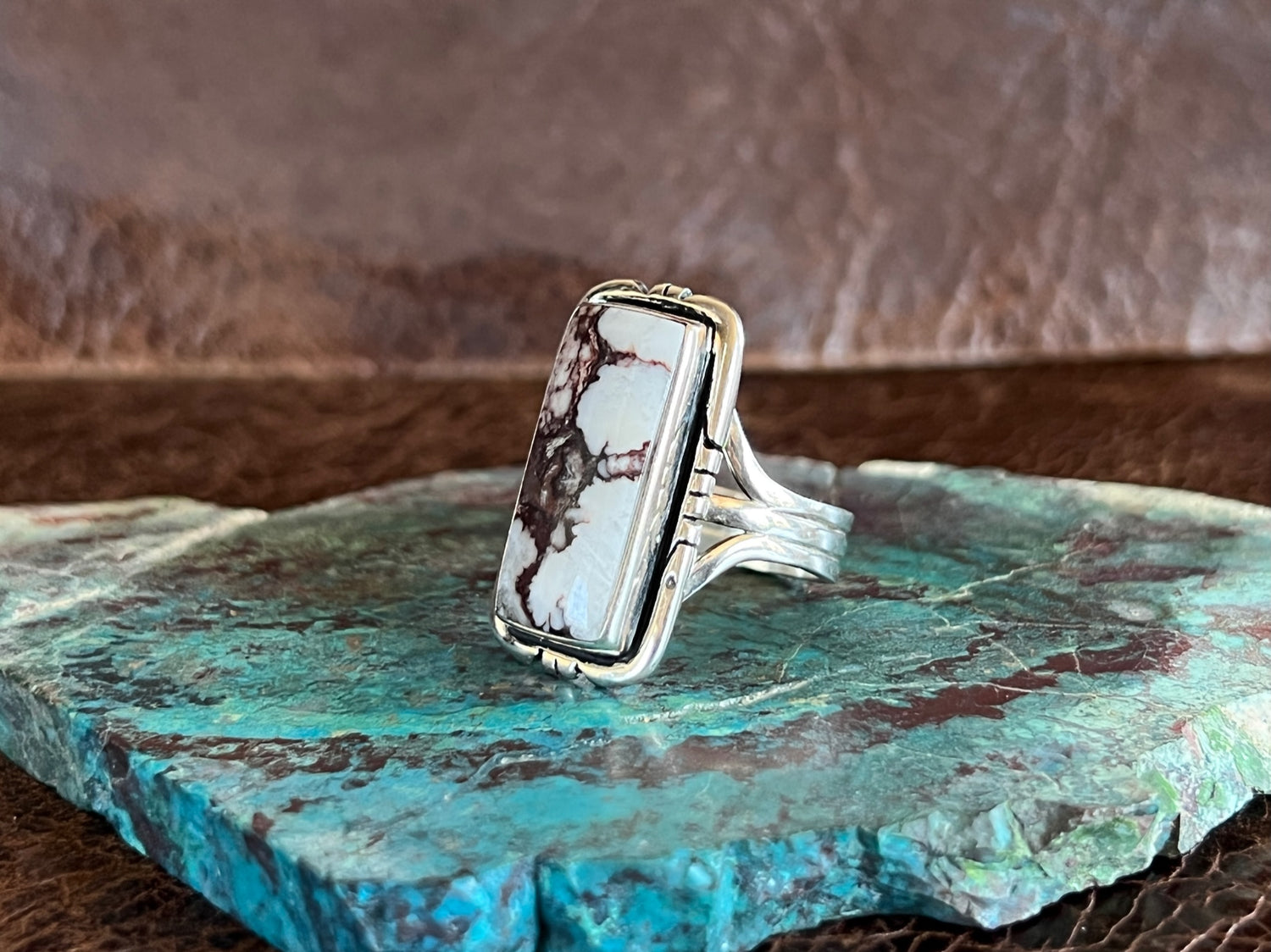 This is a gorgeous vintage Wild Horse ring! It's Native American made. The hand cut trim around the stone is traditional style & they compliment the stone beautifully. The shank is a 3 band style & is very comfortable to wear. It is stamped sterling & has the artist's hallmark: J
