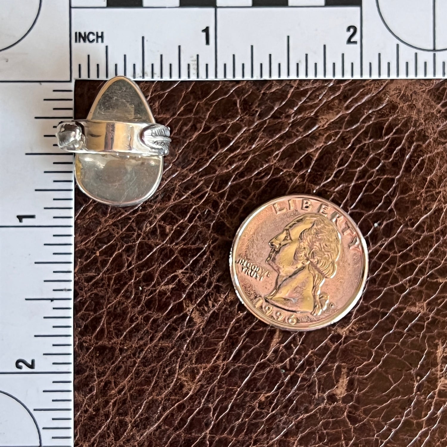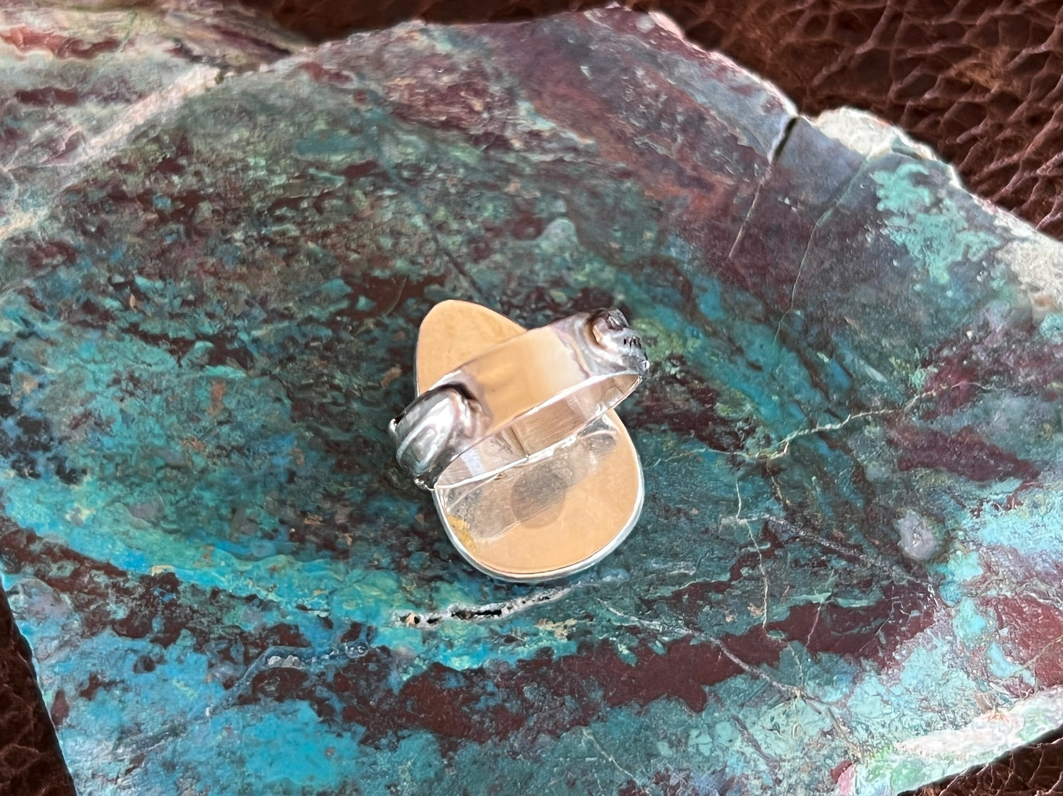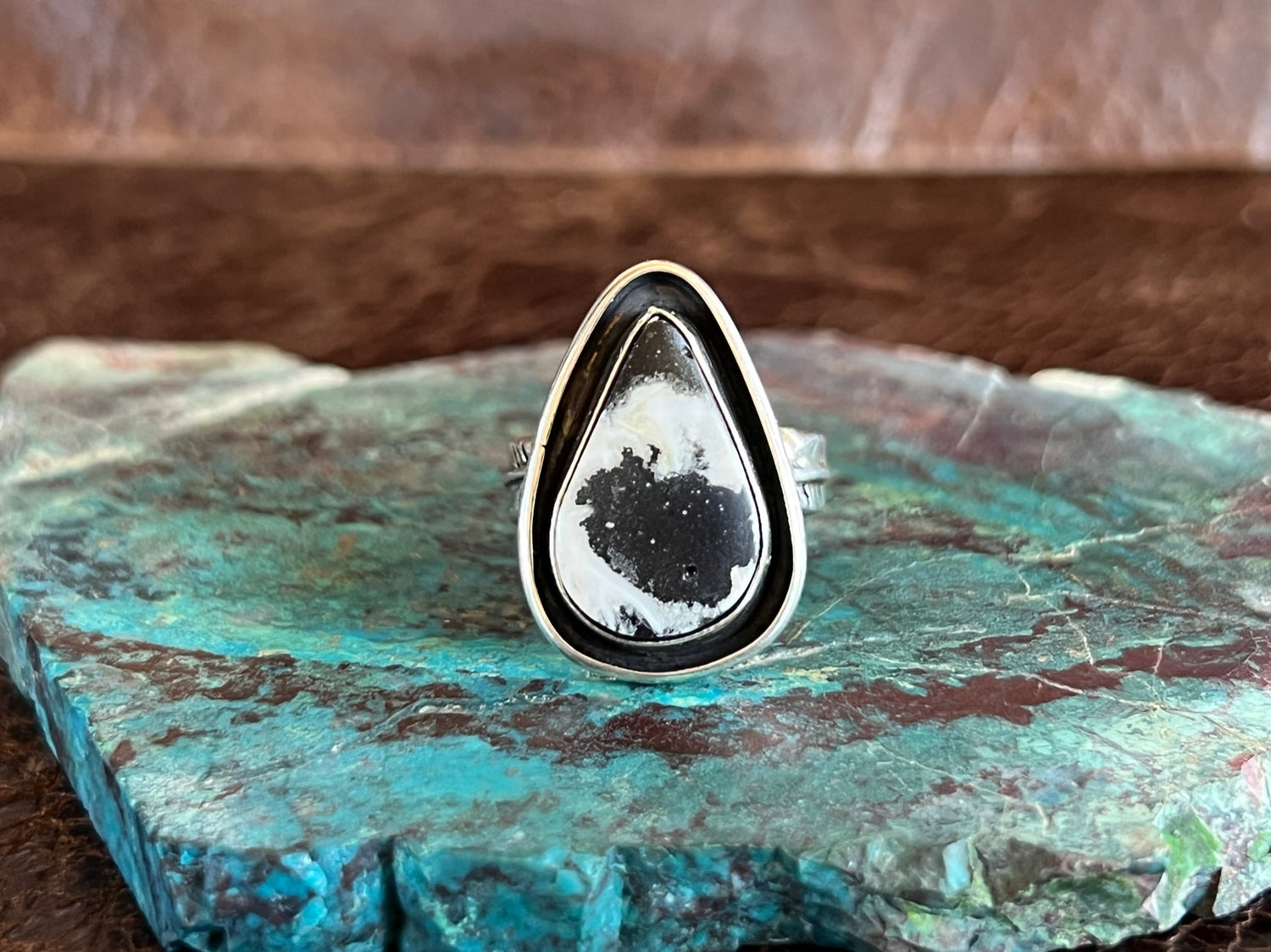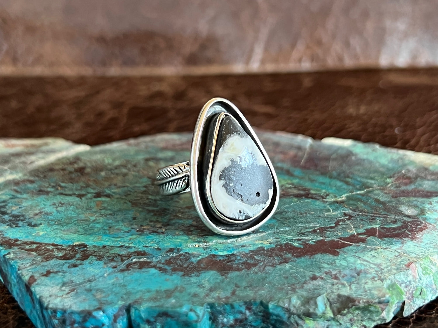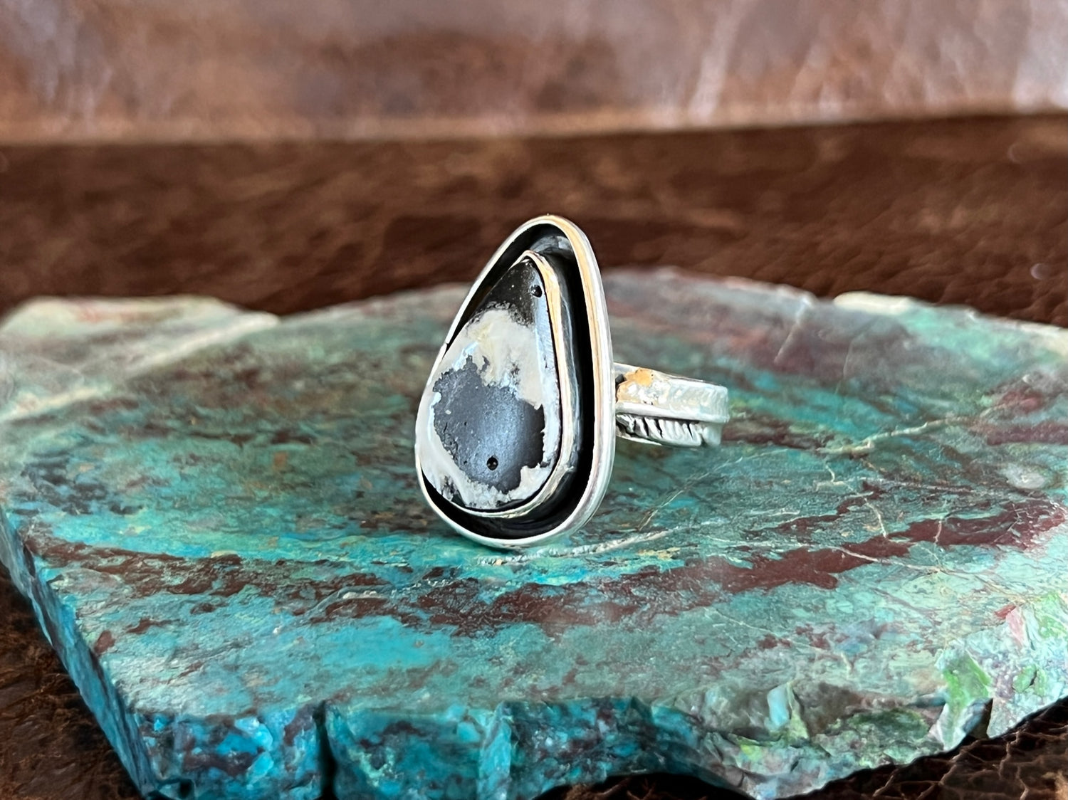 This pear shaped White buffalo stone is really complimented by the oxidized tray surrounding it. The feathers along the sides of the shank of the ring also give it an extra flair that makes it even more unique!